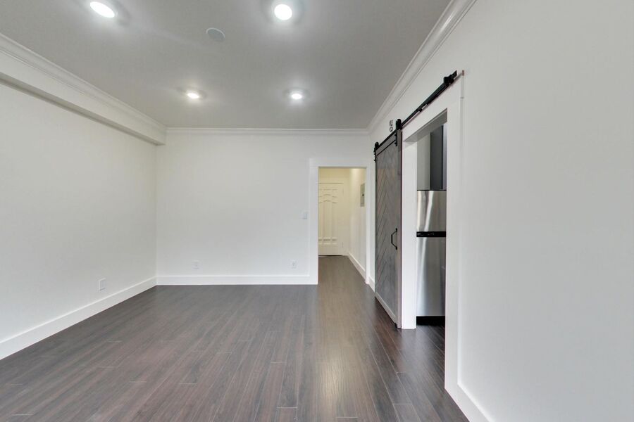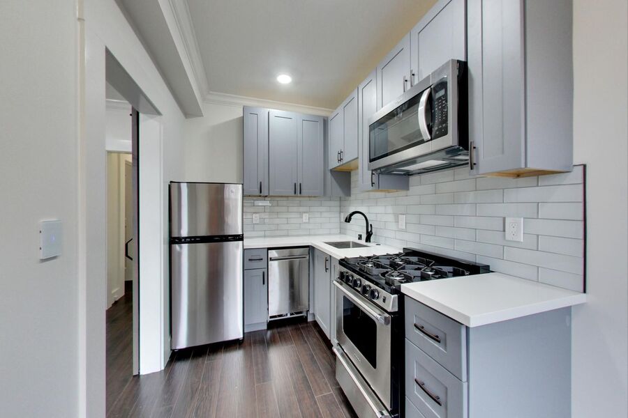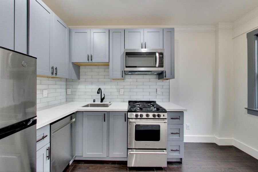 - Modern Kitchen: The kitchen is well-appointed with matching stainless steel appliances, including a dishwasher, gas stove/oven, refrigerator, and microwave. Grey shaker cabinets and marble countertops contribute to a modern and stylish kitchen design. The inclusion of enough room for a dine-in option adds convenience.