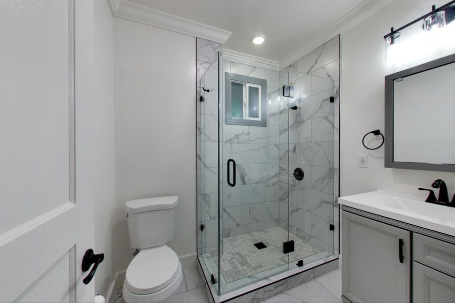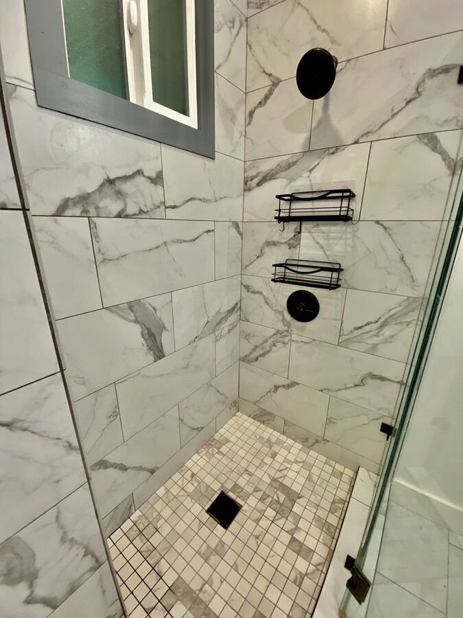 - Modern Bathroom: The bathroom features marble and matte black finishes, creating a clean and modern look. The highlight is the large luxury shower with subway-tile floors, offering both style and comfort.