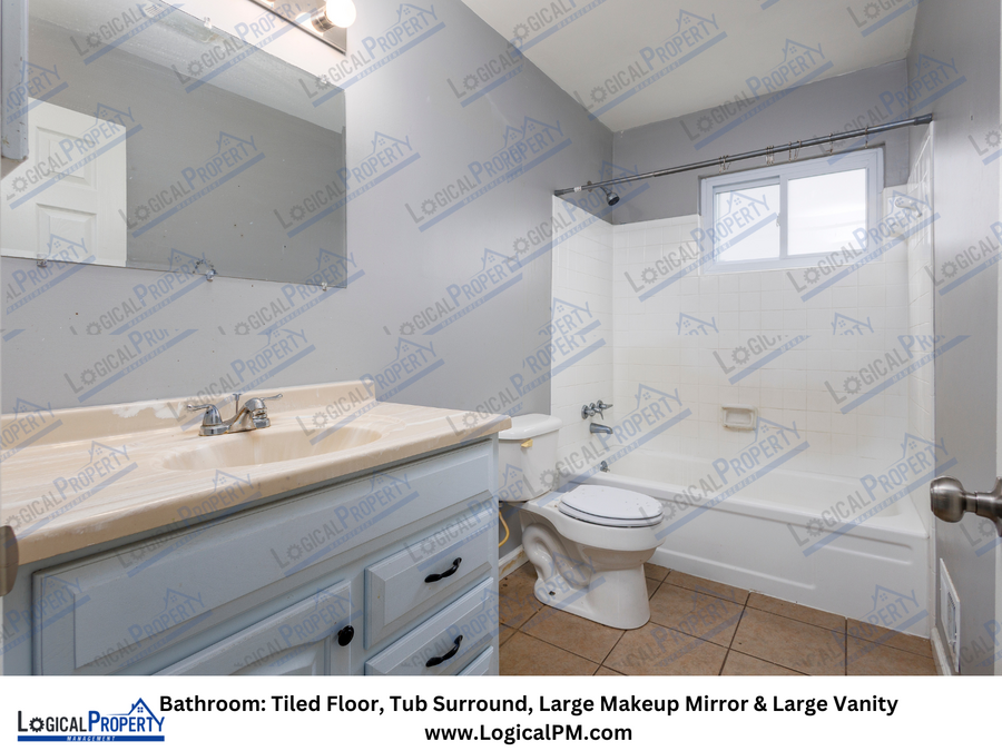This home features a bright and functional kitchen equipped with essential appliances, along with a updated bathroom designed with modern finishes and a spacious vanity and large makeup mirror.