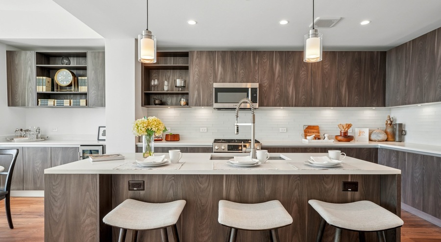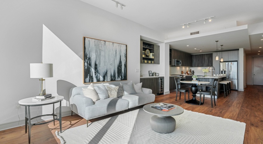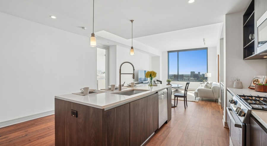 Wide-plank engineered hardwood floors in kitchen and living