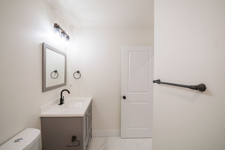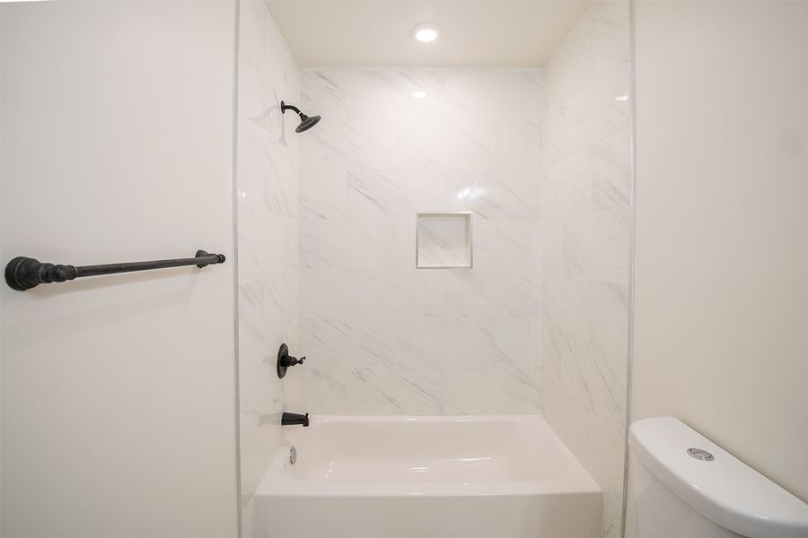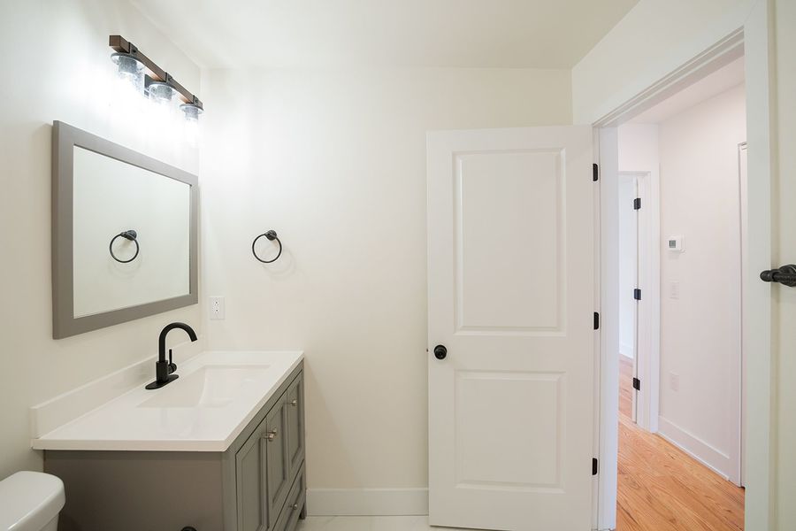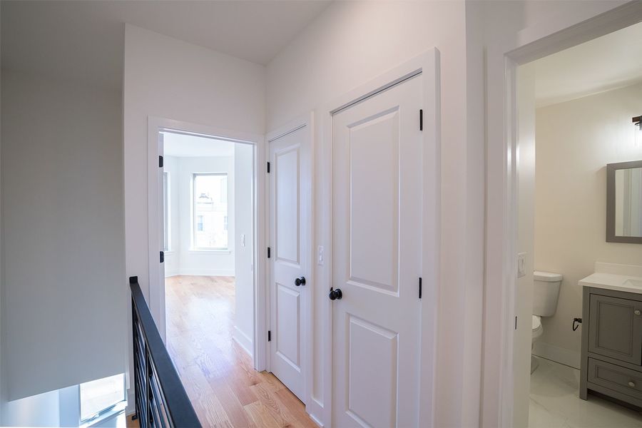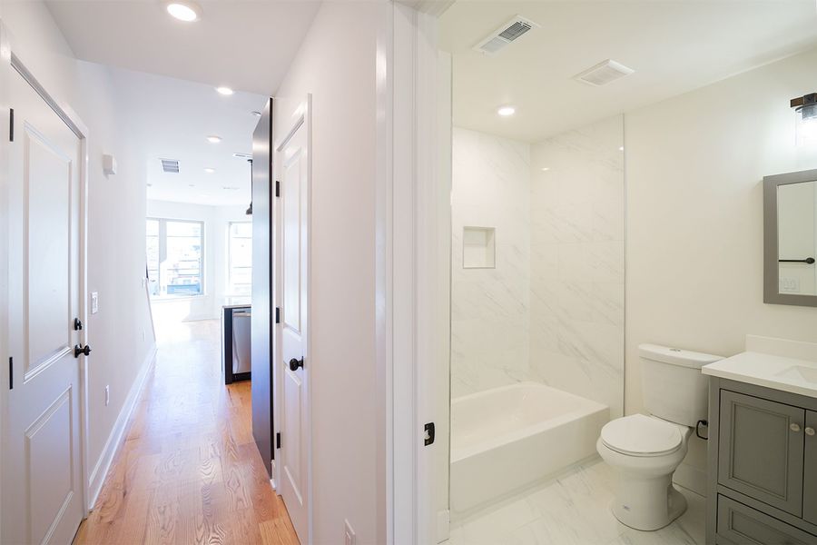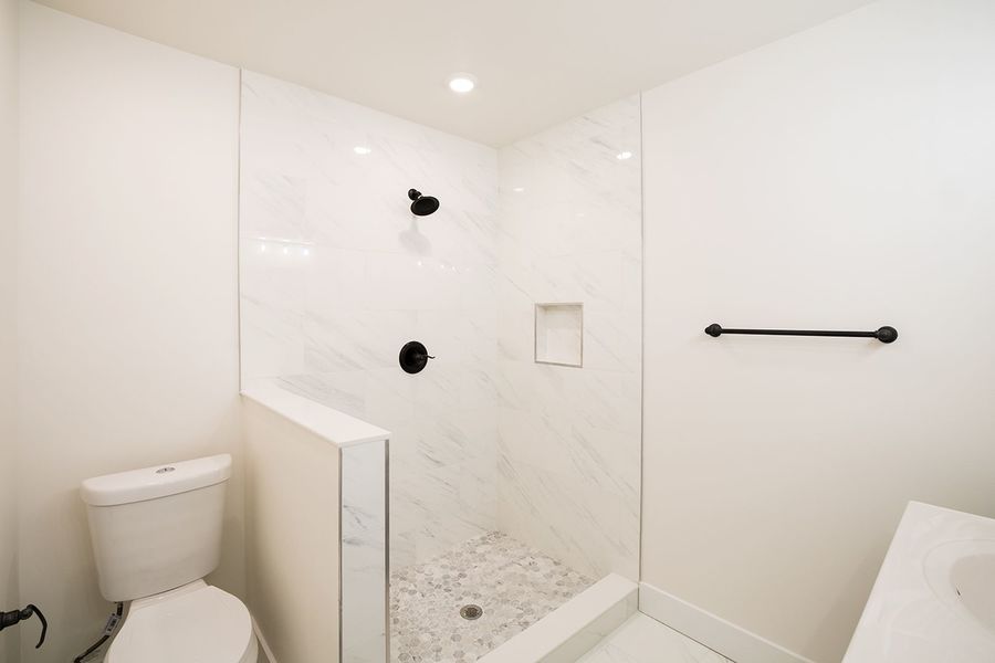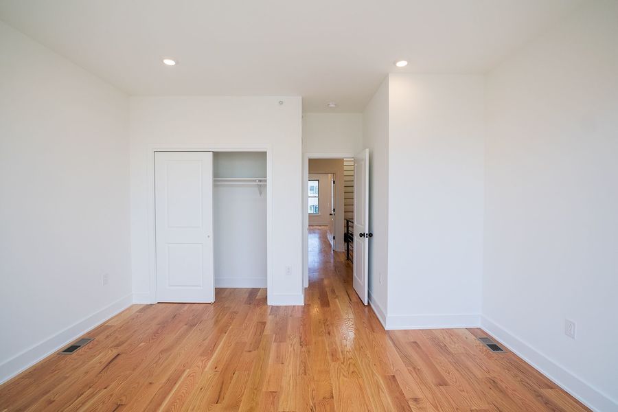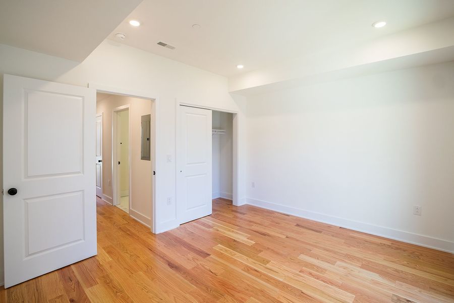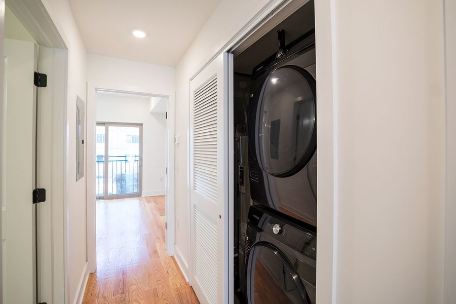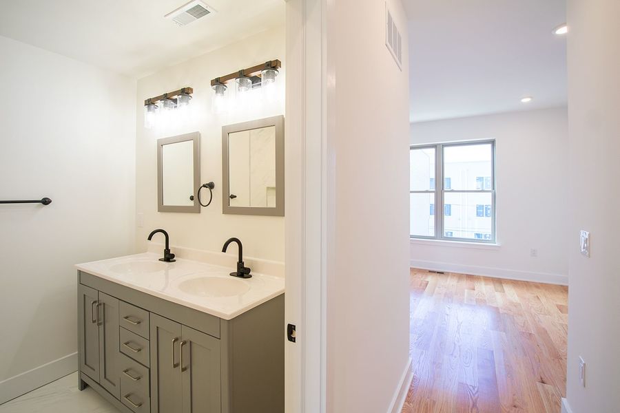 Contemporary bi-level 3 bathroom, 3 bedroom apartment available near Temple University between Norris Square and Olde Kensington! This unit spans between the second and third floors of the building and has high quality finishes throughout. Enjoy hardwood flooring, recessed lighting, central air, a private roof deck with fantastic views, and in-unit laundry. The modern kitchen boasts quartz countertops with breakfast bar seating, designer lighting overhead, and stainless steel appliances including a built-in microwave, dishwasher and electric range. The first level features a rear bedroom with a juliette balcony, full bath with a shower/tub combination, stacked washer and dryer, and a hall coat closet. Upstairs includes more common closet space, and the remaining two bedrooms and full bathrooms that flank each side of the unit for maximum privacy. The primary bath features a double sink vanity and oversized shower with beautiful stone tiling. There is plenty of space to spread out and feel right at home in this new, luxurious apartment.