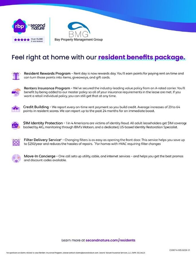 All Bay Property Management Group Austin residents are automatically enrolled in the Resident Benefits Package (RBP) for $50.00/month, which includes renters insurance, credit building to help boost your credit score with timely rent payments, $1M Identity Protection, HVAC air filter delivery, move-in concierge service making utility connection and home service setup a breeze during your move-in, our best-in-class resident rewards program, and much more! The Resident Benefits Package is a voluntary program and may be terminated at any time, for any reason, upon thirty (30) days' written notice. Tenants that do not upload their own renters insurance to the Tenant portal 5 days prior to move in will be automatically included in the RBP and the renters insurance program. More details upon application.