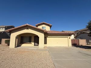 This two-story, 4-bedroom / 3-bathroom Goodyear home was just refreshed with BRAND-NEW CARPET and FRESH PAINT!  The kitchen offers an island with optional seating, tons of cabinet-space, and includes all major appliances. Well-appointed downstairs bedroom and full bathroom makes an efficient separate area for guests. Huge primary suite has ensuite bathroom with dual sinks and walk-in closets, and separate tub and shower. Upstairs loft area adds extra leisure space and there's a built-in desk for a home-office. TWO attached garages and the backyard has low-maintenance gravel landscaping. Schedule a tour before it's gone!