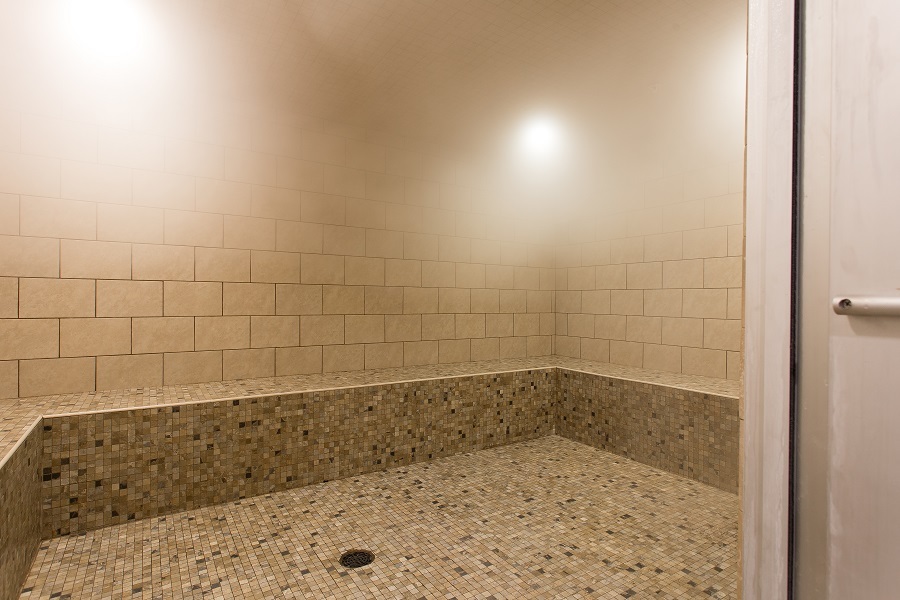 Indoor spa with waterfall, steam room, sauna, changing area and lockers