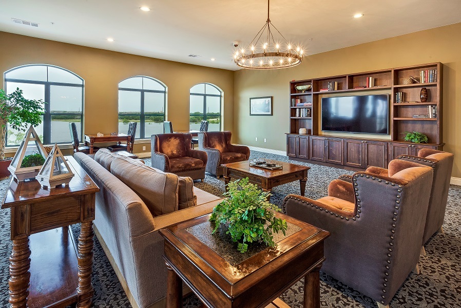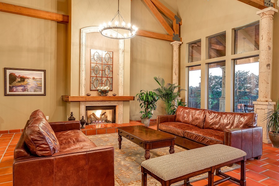 Elegant clubhouse with a fireplace, full kitchen, bar area, lounging area and veranda