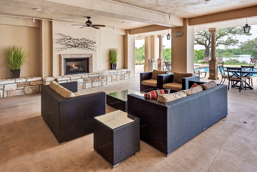 Covered lounge areas with fireplaces extending into the pool area