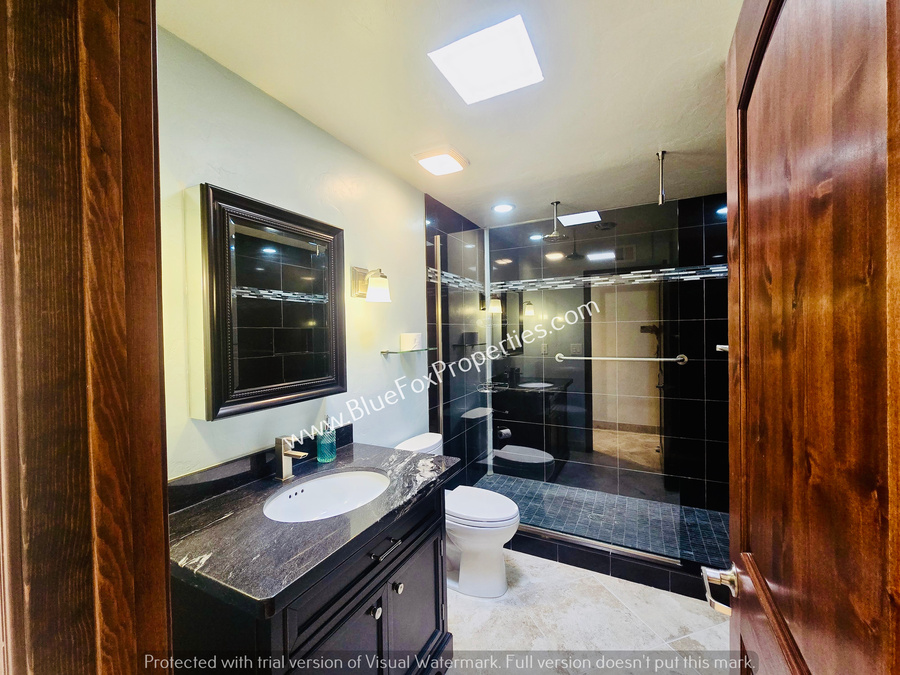 The serene primary suite is a true retreat, complete with a dual-sink vanity, soaking tub, separate glass-enclosed shower, private toilet room, and a large walk-in closet.