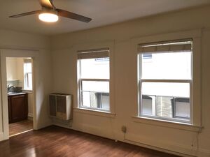 This second-floor corner studio apartment boasts hardwood floors throughout, offering a classic and durable foundation for the living space. It features essential appliances such as a fridge and stove, ensuring convenience for daily living. Additionally, the apartment features a bay window.