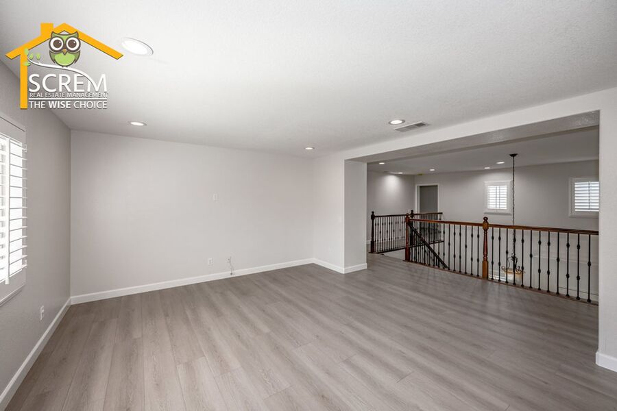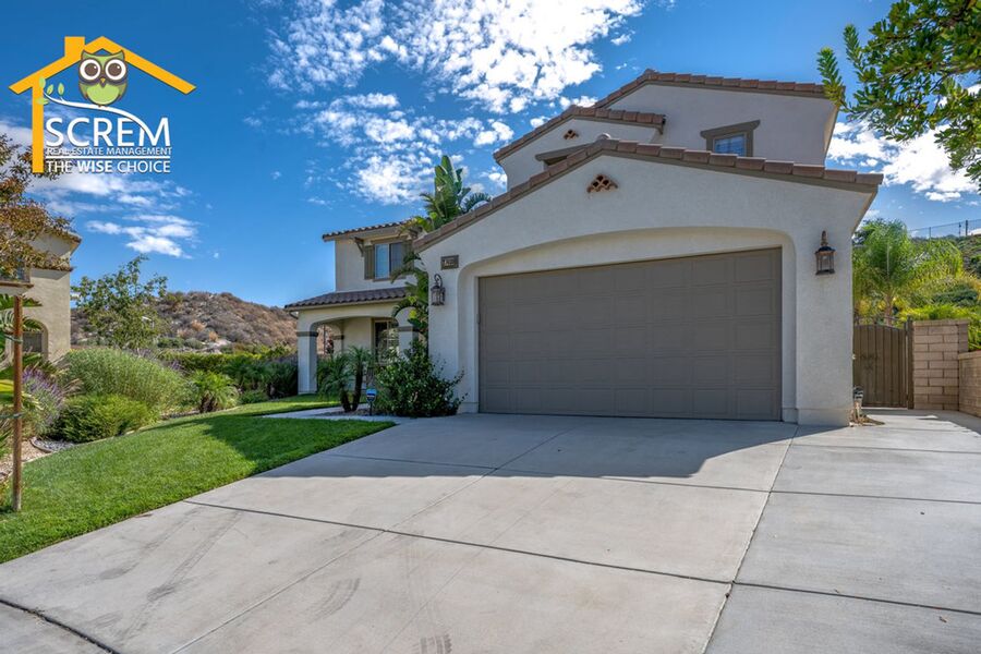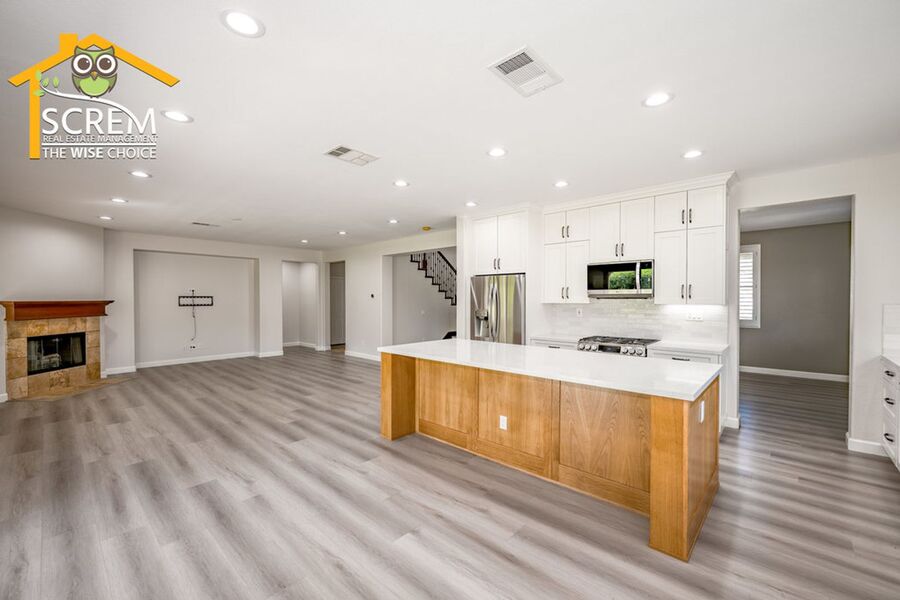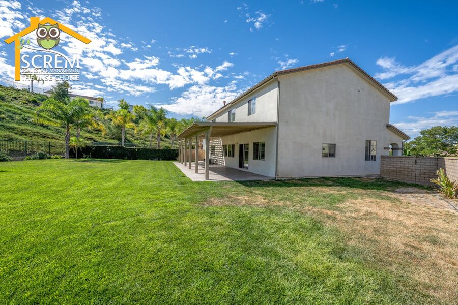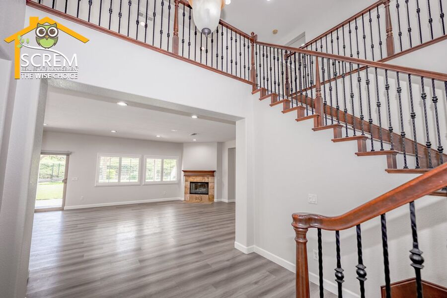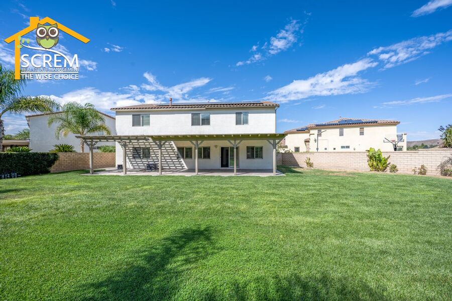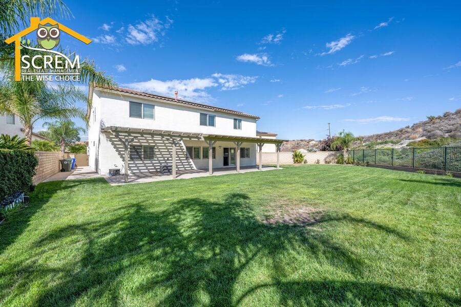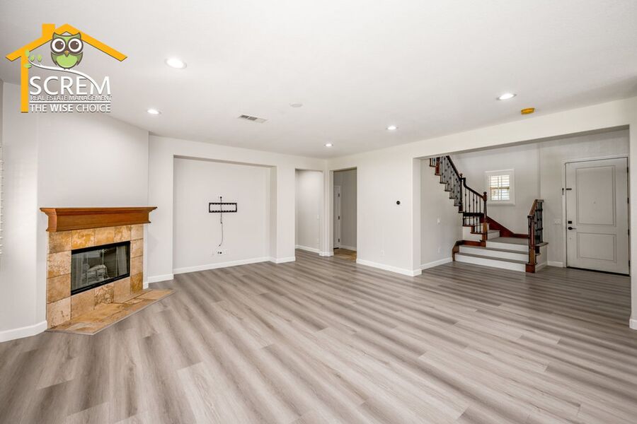 This stunning five-bedroom home with a loft and solar panels is situated at the end of a quiet cul-de-sac in Fair Oaks. The open-concept main level features a spacious living room with a fireplace, recessed lighting, and a layout that flows seamlessly into the modern kitchen. The kitchen is equipped with quartz countertops, sleek white cabinetry with brushed silver hardware, a large center island, stainless steel appliances, and a walk-in pantry. Kitchen appliances include a gas stove, a single oven, a microwave, a dishwasher, and a refrigerator. The dining area opens to a private backyard featuring a covered patio and a lush lawn, making it perfect for entertaining. A versatile front room can serve as either a formal dining room or a formal living room. There is also a downstairs bedroom and a bathroom with a walk-in shower, providing convenience for guests. Upstairs, a spacious loft adds extra living space. The primary suite boasts new flooring and a luxurious bathroom complete with dual sinks, a garden tub, a separate shower, and a large walk-in closet. Additionally, the upper level features three more bedrooms, all equipped with new flooring and walk-in closets. One of the guest bedrooms includes a bonus space that can be utilized as an office or sitting area. The home also features a downstairs laundry room with washer and dryer hookups, a three-car tandem garage, and energy-efficient solar panels. Community amenities offer a pool, spa, park, and playground, making this residence the perfect blend of comfort and convenience. Conveniently located near shopping, restaurants, and the 14 Freeway. *Owner may consider a small pet.
