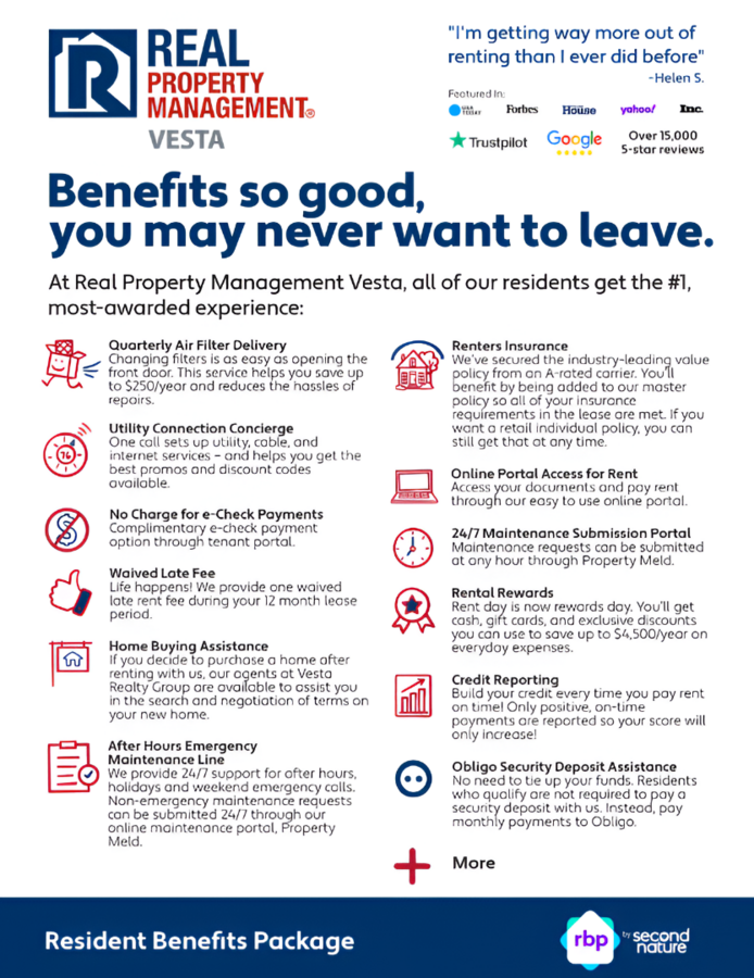 All RPM Vesta residents are enrolled in the Resident Benefits Package (RBP) for $34.95/month which includes renters insurance, our best-in-class resident rewards program, HVAC air filter delivery (for applicable properties), credit building to help boost your credit score with timely rent payments, move-in concierge service making utility connection and home service setup a breeze during your move-in, security deposit alternative with Obligo and much more! More details upon application.