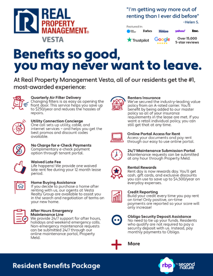 All RPM Vesta residents are enrolled in the Resident Benefits Package (RBP) for $34.95/month which includes renters insurance, our best-in-class resident rewards program, HVAC air filter delivery (for applicable properties), credit building to help boost your credit score with timely rent payments, move-in concierge service making utility connection and home service setup a breeze during your move-in, security deposit alternative with Obligo and much more! More details upon application.