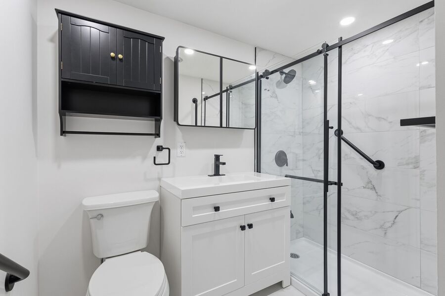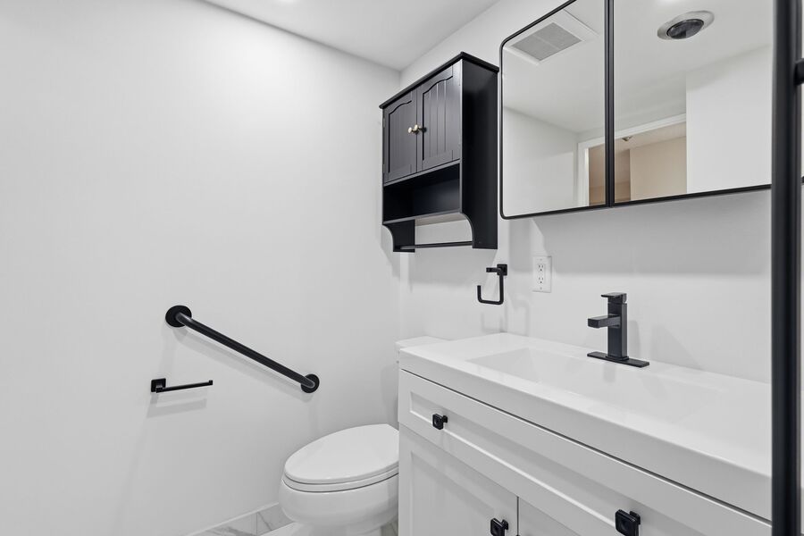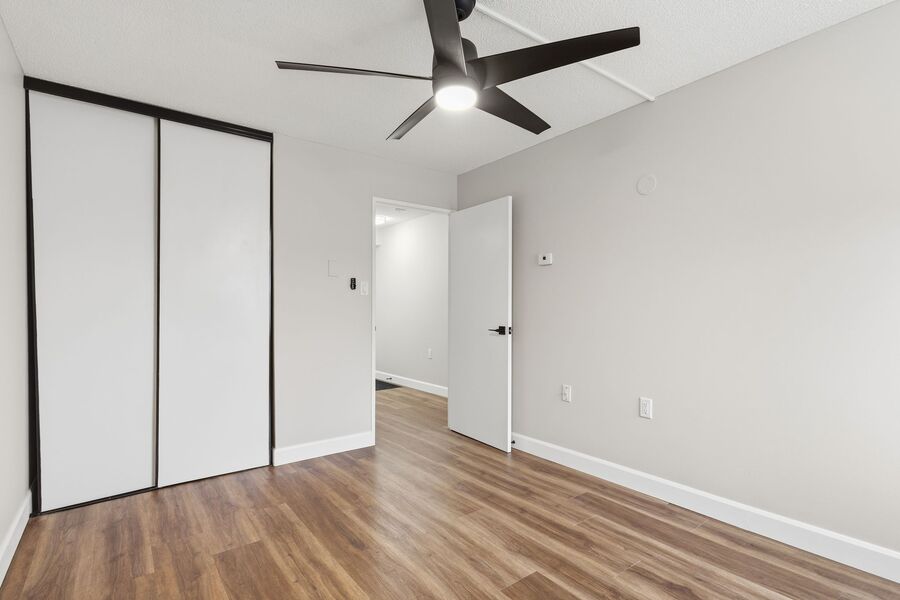 The beautifully updated bathroom is accented with a modern black vanity and fixtures, along with a walk-in shower. Additional highlights include a large storage closet, luxury laminate flooring throughout, neutral paint tones, and elegant ceiling fans in both the living room and bedroom.