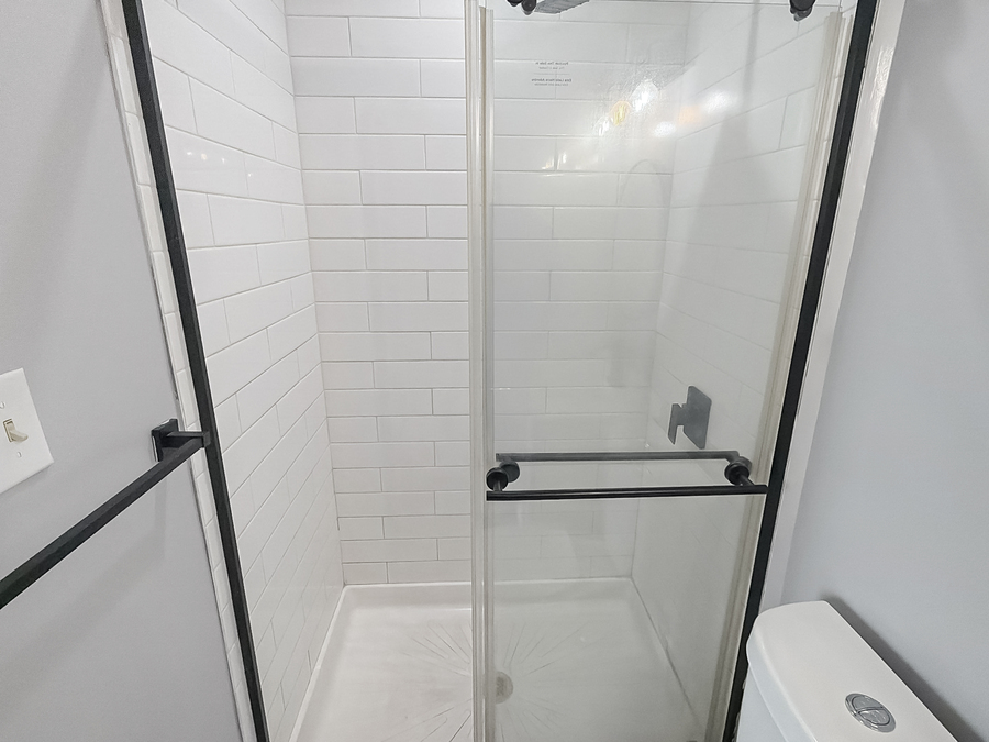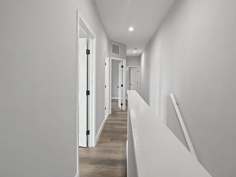 The upper level includes four generously sized bedrooms, including a spacious primary bedroom, along with two full bathrooms finished with sleek tilework, modern vanities, and matte black fixtures. The layout is ideal for larger households, roommates, or work-from-home flexibility.