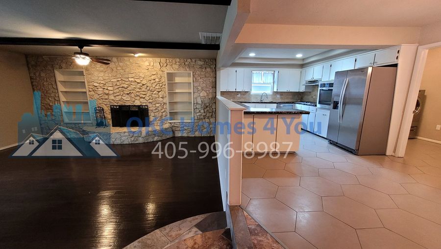 This 3 bedroom, 2 bathroom home is the one you've been waiting for! An expansive foyer with a stone statement wall greets you and leads you into the main living space with a beautiful stone fireplace with built-ins, decorative beams, a dry bar, and large barn doors to the enclosed patio. This space is perfect for a sunroom, playroom, office, workout room, or more! Cooking is a breeze in the kitchen with stained concrete counters, tiled backsplash, new dishwasher and lots of storage. It is open to the dining room and partially open to the living room. All of your appliances are included! There is even a 2nd refrigerator (provided in as-is condition). The bedrooms are all spacious with walk-in closets. The en suite master bath and jack-and-jill hall bath are beautifully updated. A fully-fenced backyard and 2 car attached garage with opener complete this amazing home.
