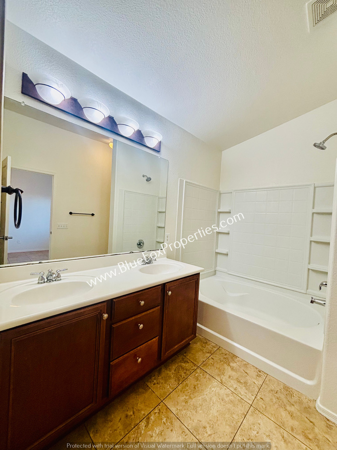 The primary bedroom offers an en-suite bathroom featuring a double-sink vanity, shower/tub combination, and a generously sized closet.