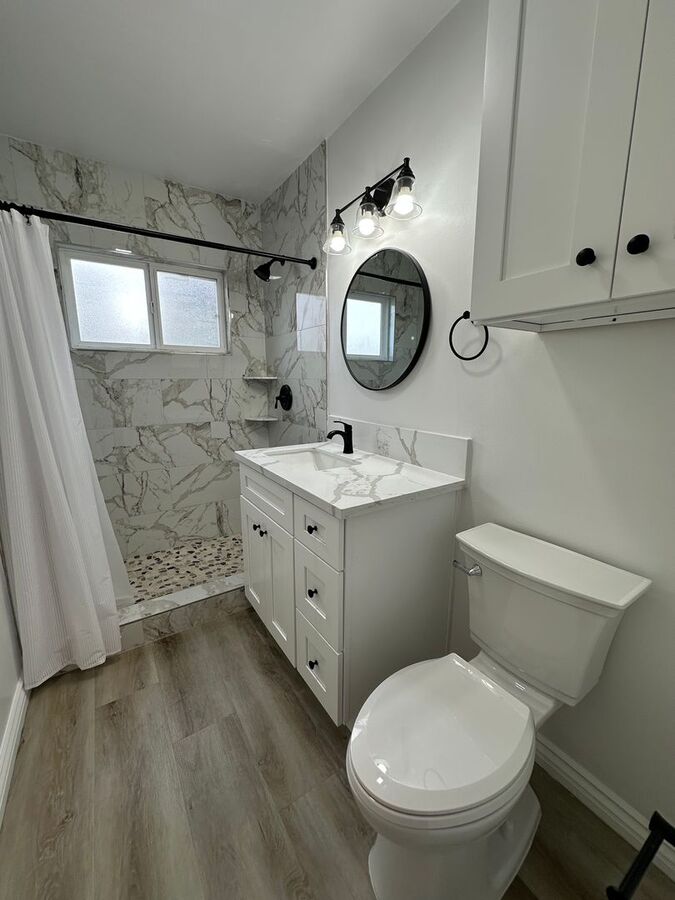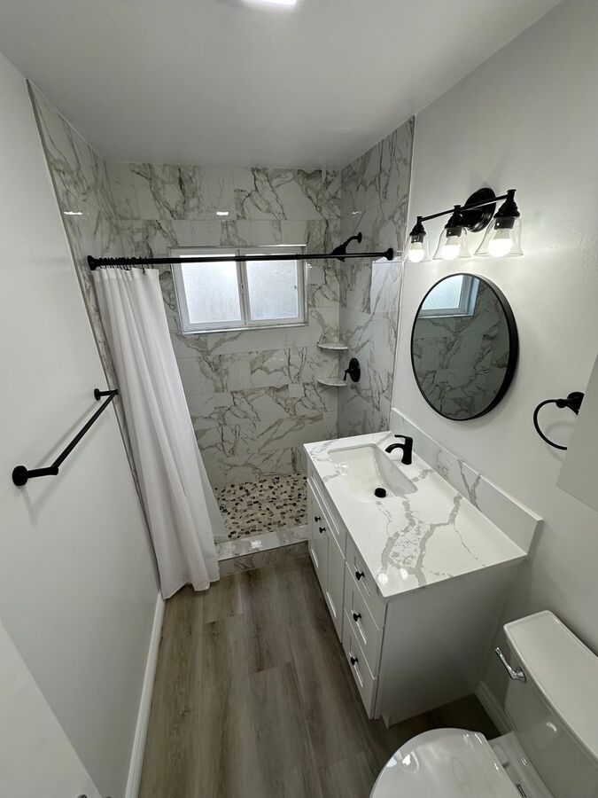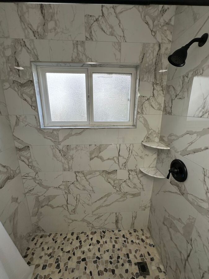 • Remodeled bathroom with marble step-in shower
