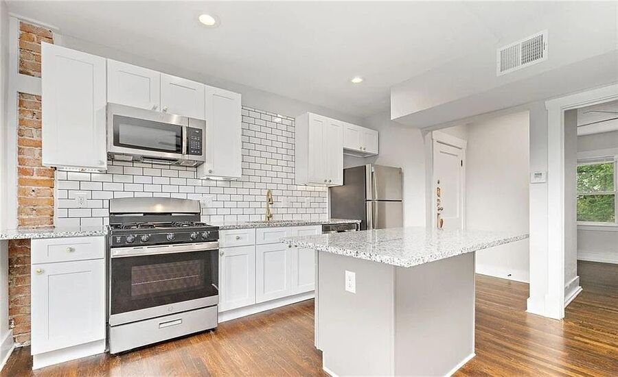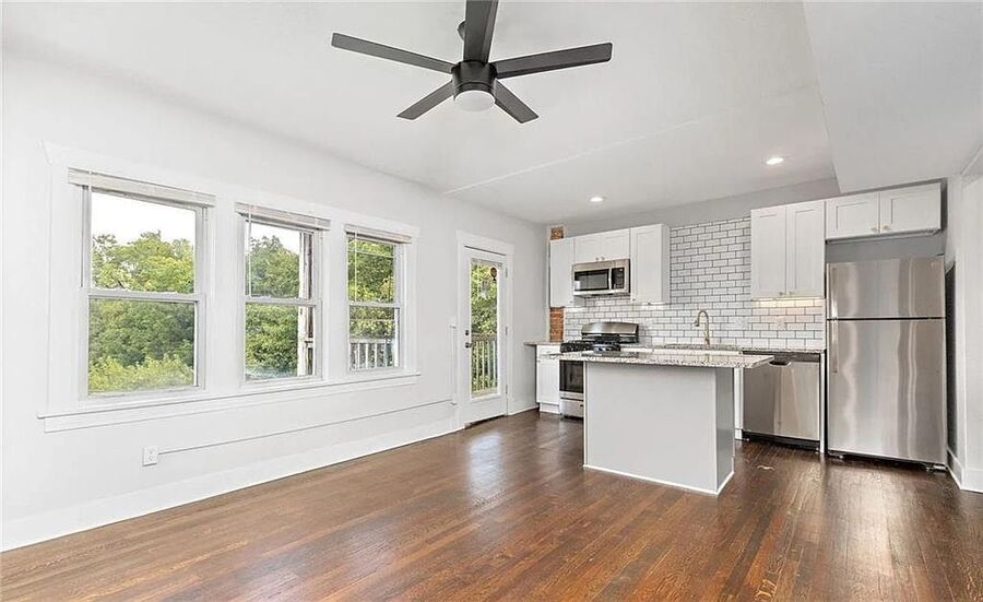 This attractive 2 bedroom, 1 bath apartment offers an inviting open kitchen and living room designed for both comfort and functionality. Beautiful hardwood floors, abundant natural light, and a ceiling fan create a warm, airy atmosphere throughout the main living space. The updated kitchen features modern cabinetry, granite countertops, a large island ideal for everyday living or entertaining, and stainless steel appliances including a refrigerator, microwave, dishwasher, and stove.
