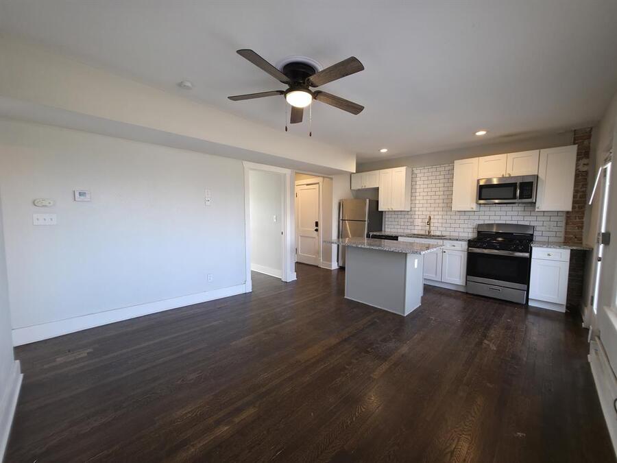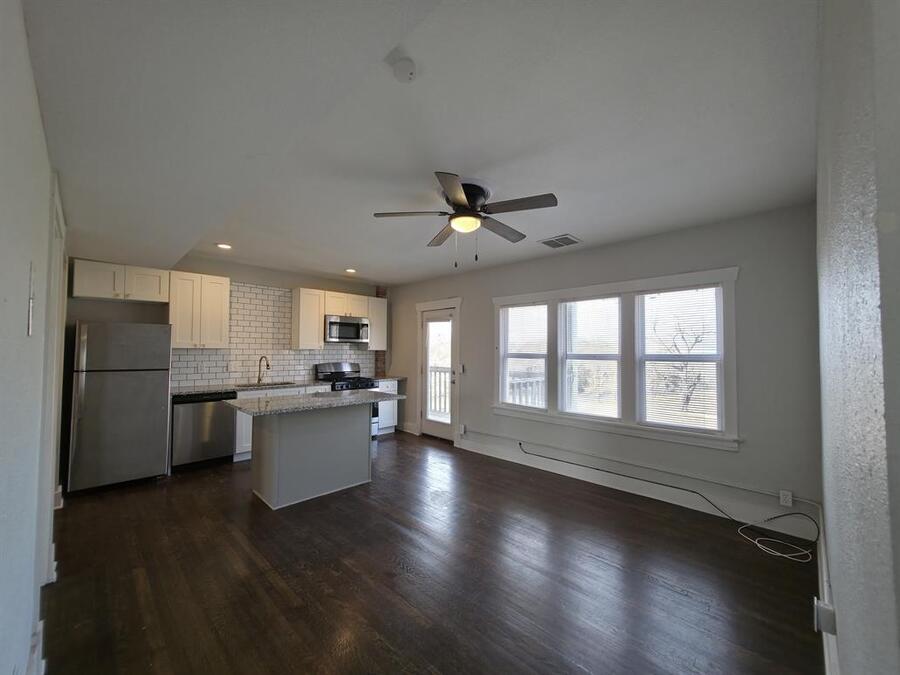 This attractive 2 bedroom, 1 bath apartment offers an inviting open kitchen and living room designed for both comfort and functionality. Beautiful hardwood floors, abundant natural light, and a ceiling fan create a warm, airy atmosphere throughout the main living space. The updated kitchen features modern cabinetry, granite countertops, a large island ideal for everyday living or entertaining, and stainless steel appliances including a refrigerator, microwave, dishwasher, and stove.
