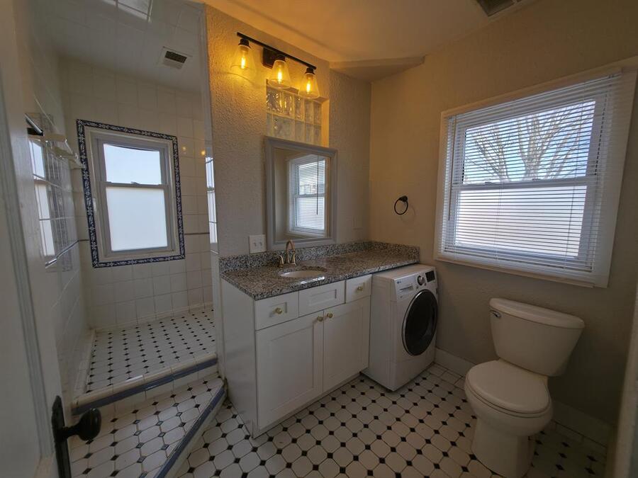 Both bedrooms are generously sized and continue the appeal with hardwood floors, ample natural light, and ceiling fans for year round comfort. The spacious bathroom is well appointed with tile flooring, updated cabinetry, granite countertops, a washer and dryer combo unit, and a large walk in shower, offering a clean and contemporary feel.