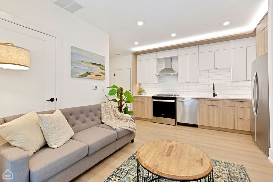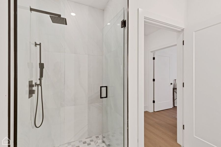 • Luxury engineered wide-plank flooring throughout with swirly grey glass tilework in bathrooms
