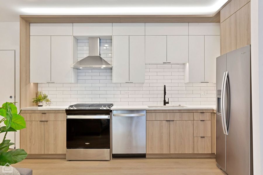 • Whirlpool stainless steel appliances including dishwasher, oven/range, microwave and refrigerator