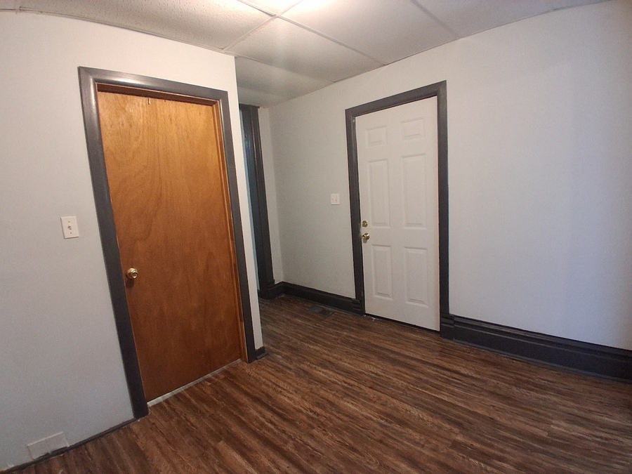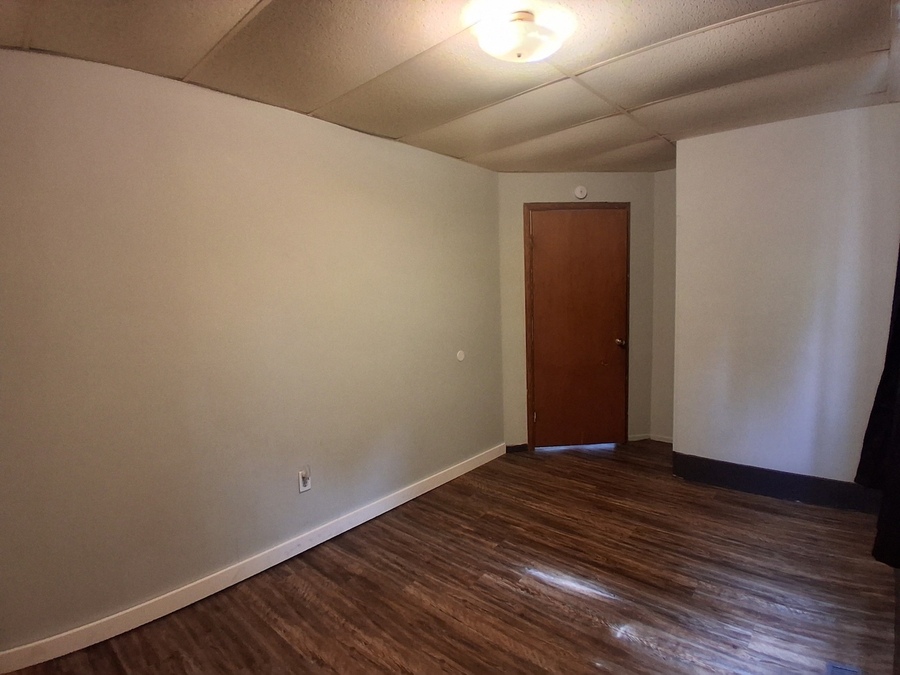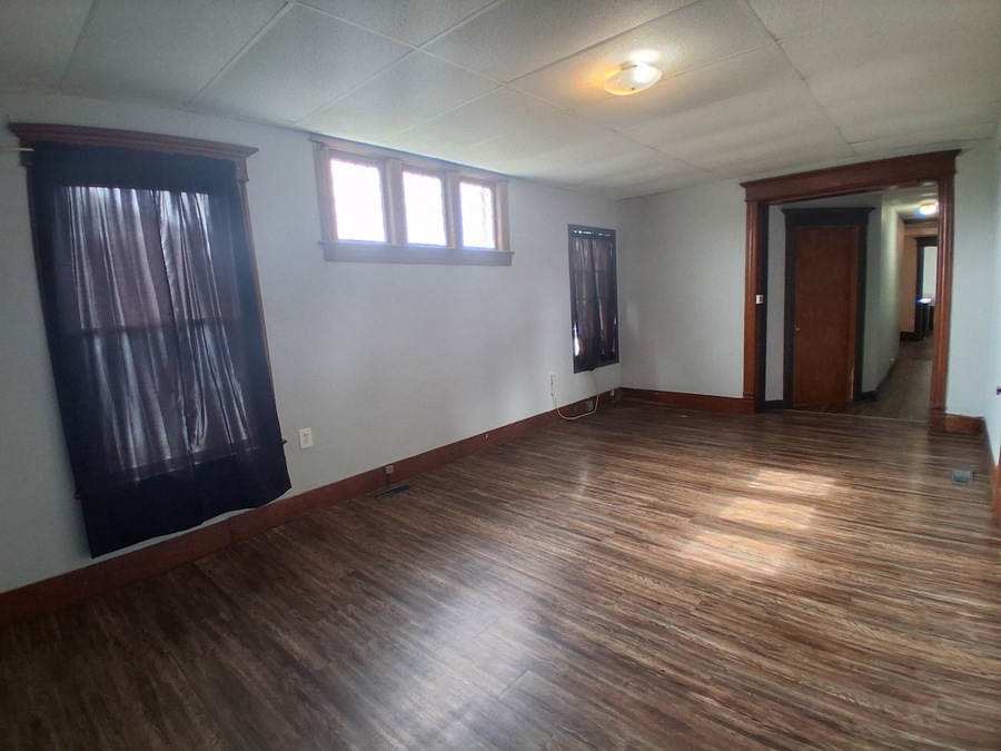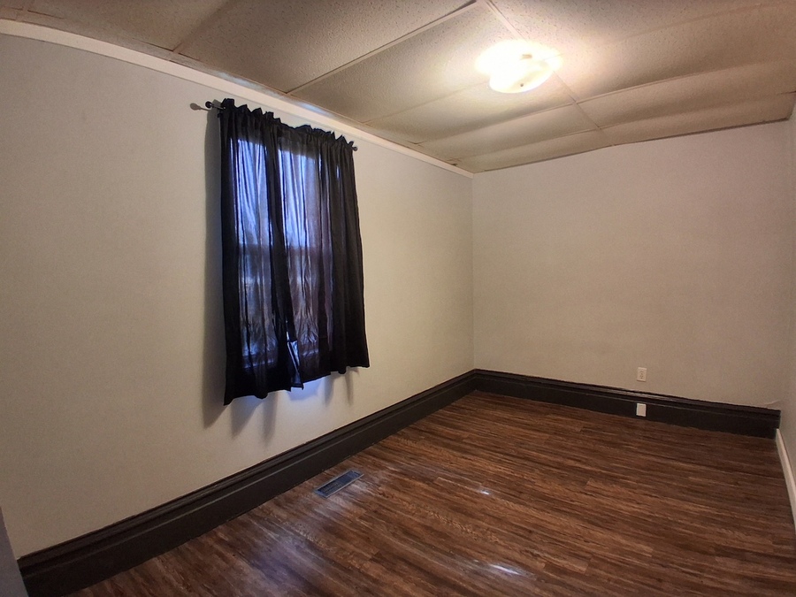 This apartment features spacious rooms that allow for flexible furniture placement and daily use. Plank flooring runs throughout the unit, and a built-in window A/C unit provides added comfort. The layout emphasizes usable living space with a straightforward, functional flow.