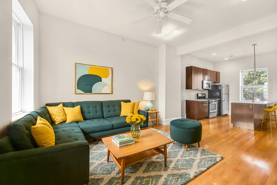 Welcome to 2136 E Dauphin St #301! This is a 1 bedroom, 1 bathroom third floor apartment featuring 1 off-street parking and an open floor plan with modern finishes and abundant sunlight. Enter into the main living area with hardwood floors and recessed lighting that follow you through the unit. There's a ceiling fan for added comfort and great natural light for a spacious and bright atmosphere. The open common area leads back to your modern kitchen boasting dark cabinetry, an island with counter seating and extra prep space, and sleek stainless steel appliances including dishwasher, built-in microwave, refrigerator, and oven-stove. Head into your sizable bedroom offering a charming round window, a ceiling fan, and good closet space. You can access your bathroom from both the bedroom and the living area for added convenience. Bathroom features include a lighted vanity with storage and a beautiful, fully tiled shower stall. There's a closet by the entrance with your stacked washer and dryer and central a/c will ensure your comfort all year. 1 off-street parking spot is available behind the building for an additional $100/month and additional storage is included. Located in East Kensington, this unit is perfect for those seeking comfort and style. Don't miss out on this fantastic opportunity!