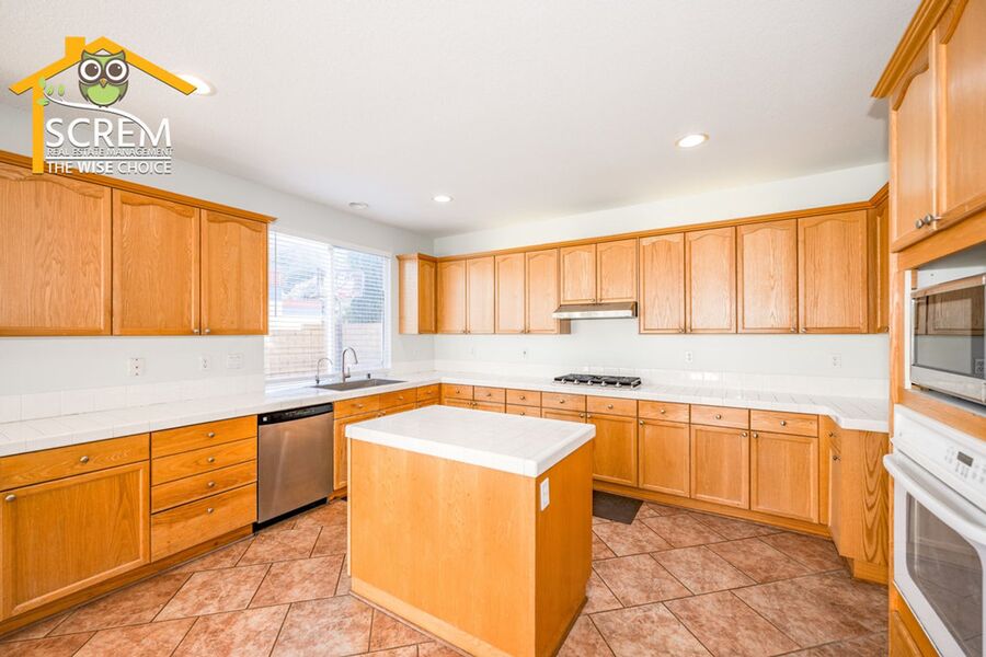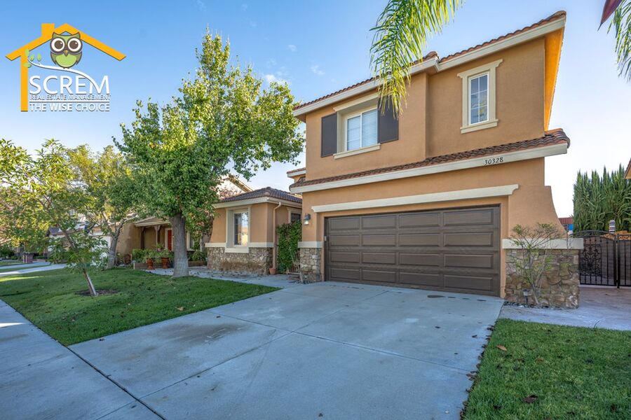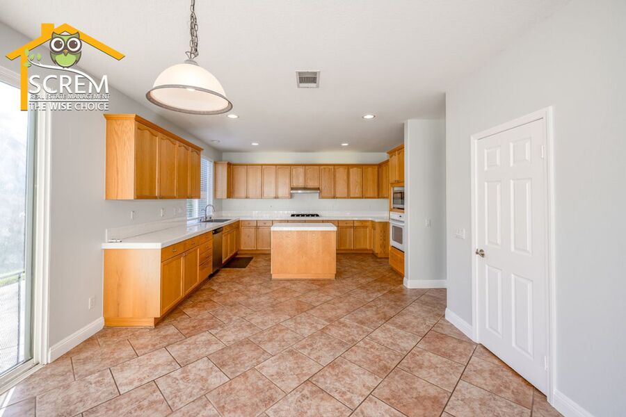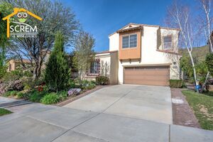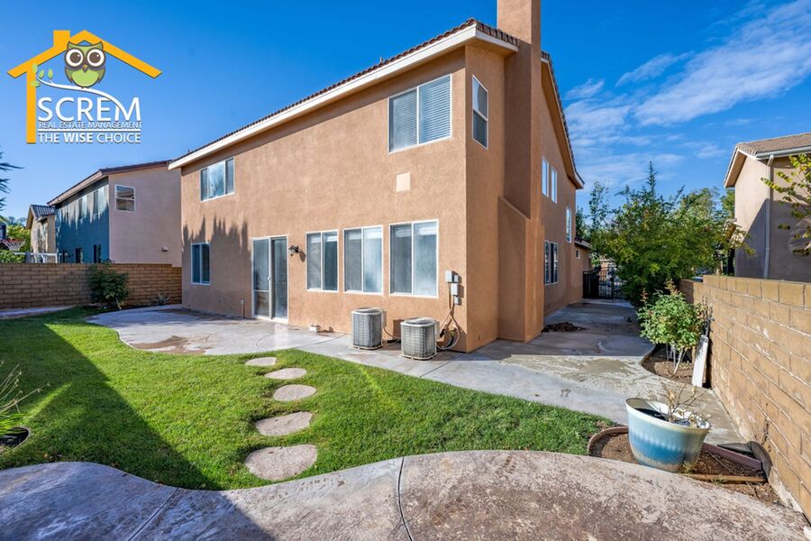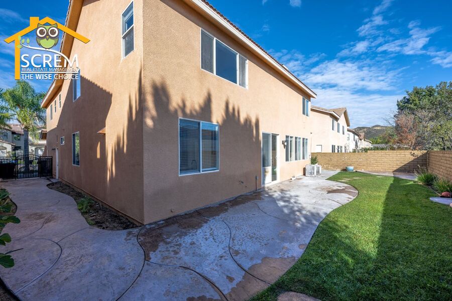 Spacious five-bedroom home plus office in Castaic offers the perfect blend of comfort and style. A gated entry leads to a charming front courtyard and impressive curb appeal. Inside, the elegant living and dining rooms feature cathedral ceilings, abundant natural light, and beautiful hardwood floors. The open kitchen is ideal for entertaining, with tile countertops, a center island, and essential appliances including a gas stovetop, oven, microwave, and dishwasher. Adjacent to the kitchen is a bright dining area with a sliding glass door that opens to a large, private backyard with fruit trees and a wraparound patio, perfect for outdoor gatherings. The inviting family room features a ceiling fan, a fireplace, and more beautiful hardwood flooring, creating a warm, comfortable space to unwind. Downstairs, you’ll find a bedroom with an attached full bathroom, as well as a separate office with double doors and another full bath, ideal for working from home or hosting guests. Upstairs is a spacious loft with a ceiling fan. The primary suite is a true retreat, featuring vaulted ceilings, hardwood flooring, mirrored double closets, and serene mountain views. Its attached bathroom includes dual sinks, a vanity, a walk-in shower, and a relaxing Jacuzzi tub. Three additional guest bedrooms, one with a walk-in closet, and a full bathroom with dual sinks. Completing the upstairs is a convenient laundry room with washer and dryer hookups and a generous walk-in linen closet. The home also includes an attached two-car garage. Conveniently located near schools, shopping, restaurants, and the 5 Freeway. *Owner may consider a small pet.