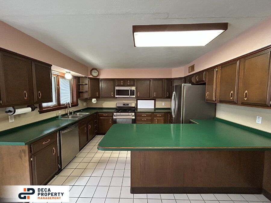 The eat-in kitchen offers tile flooring, ample cabinet and counter space, and a full set of appliances including a refrigerator, gas stove, dishwasher, and microwave, making it perfect for everyday cooking and gatherings.