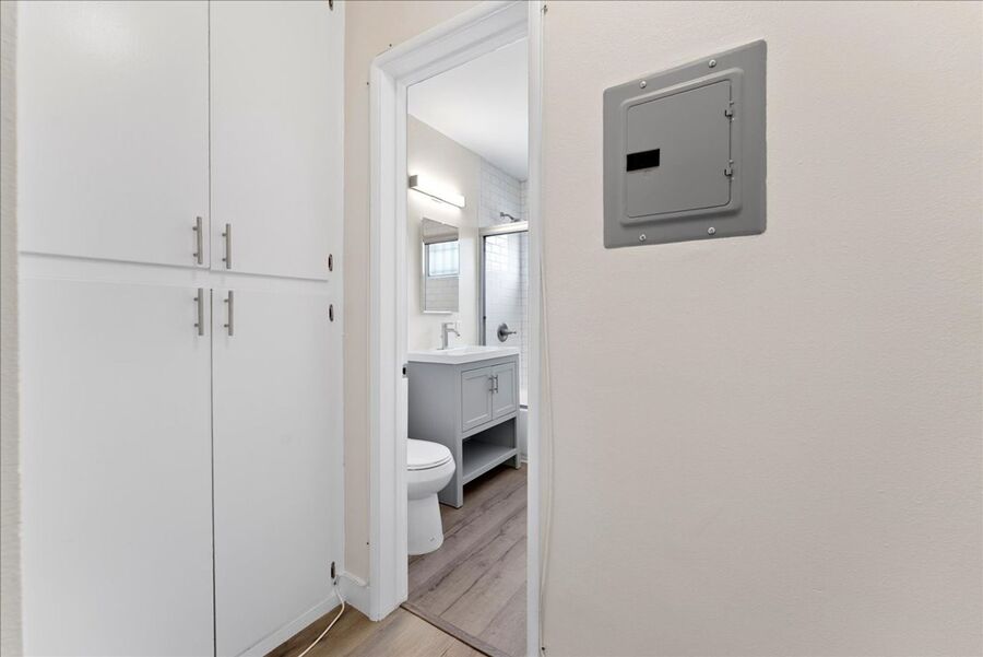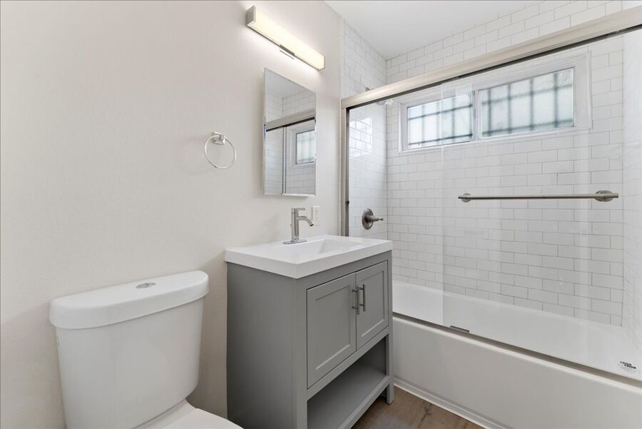 The bedroom offers comfort and convenience with a ceiling fan and large window with plenty of natural sunlight, while the brand-new bathroom boasts a stylish vanity, updated lighting, and contemporary fixtures. Sunlight pours through the windows, enhancing the inviting atmosphere of your home.