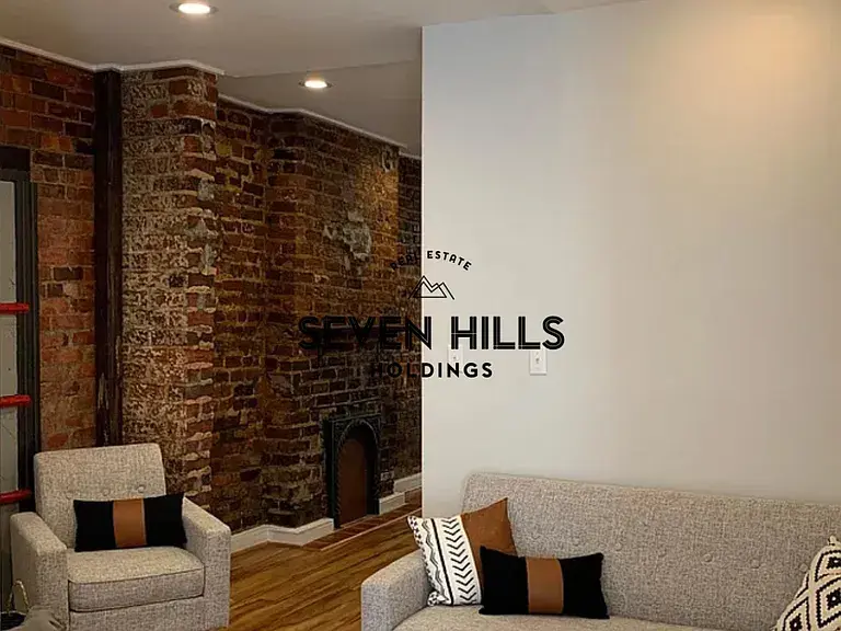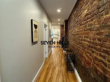 The home features exposed brick walls throughout. Residents have access to four private parking spots next to the building.