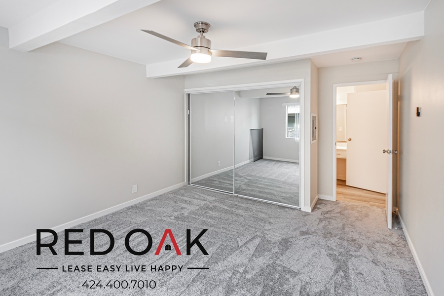 ~ Peaceful Retreat: Spacious bedroom with mirrored closet and ceiling fan.