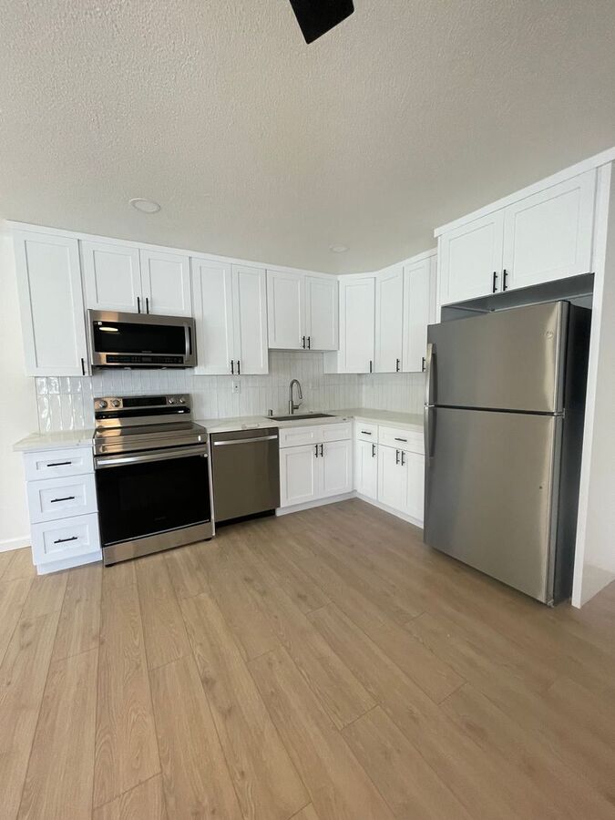 Step into this beautifully updated 2 bedroom, 1 bath unit featuring updated flooring throughout and modern finishes in every room. Enjoy an impressive kitchen with quartz countertops, gas stove, dishwasher, refrigerator, plenty of cabinets, and decorated w/ a tile backsplash. Unit also has central HVAC and parking