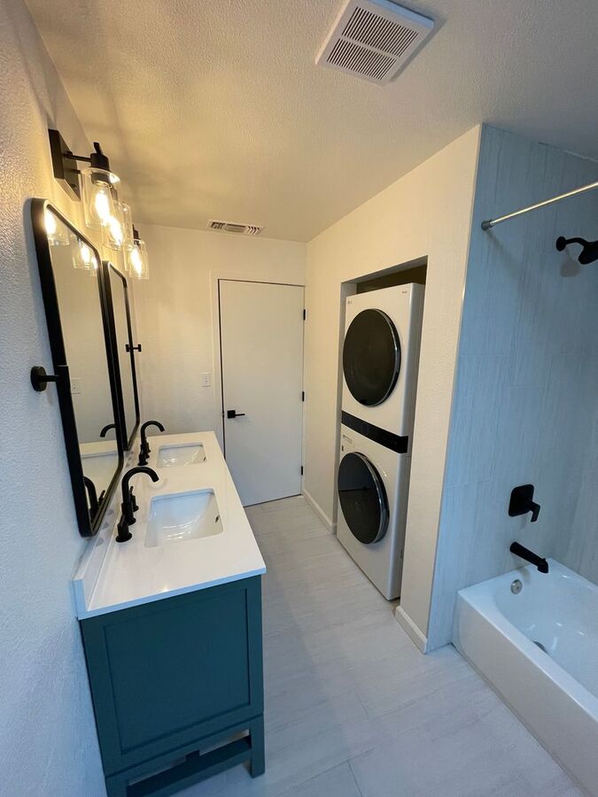 Both bedrooms have wood plank floor for ease of cleaning. Bathroom has double sinks, tub with shower and updated finishes to include tile surround for tub area