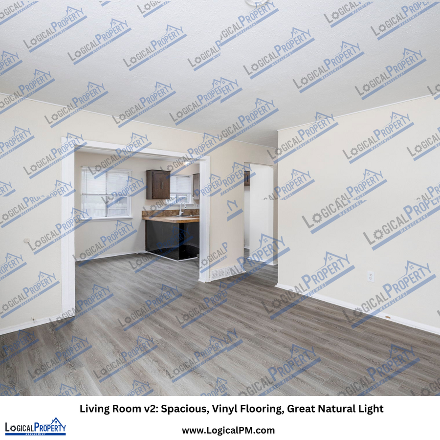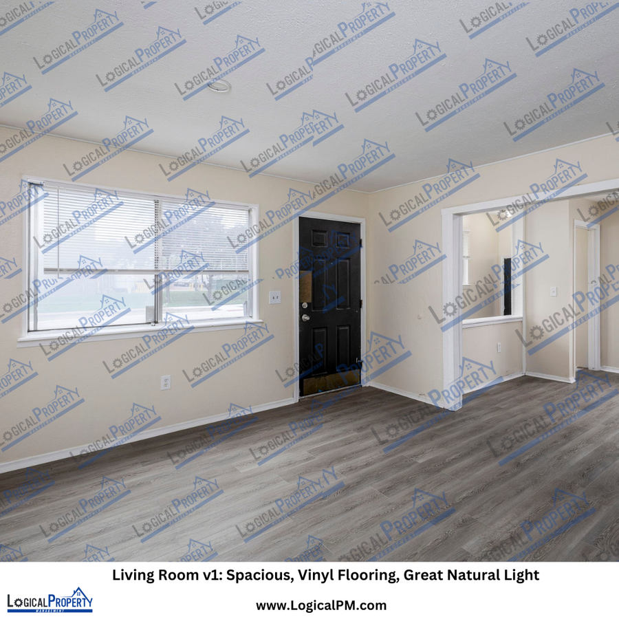 The inviting living room offers large windows, durable vinyl flooring, and a seamless flow into the kitchen and dining area creating an ideal space for relaxing or hosting guests.