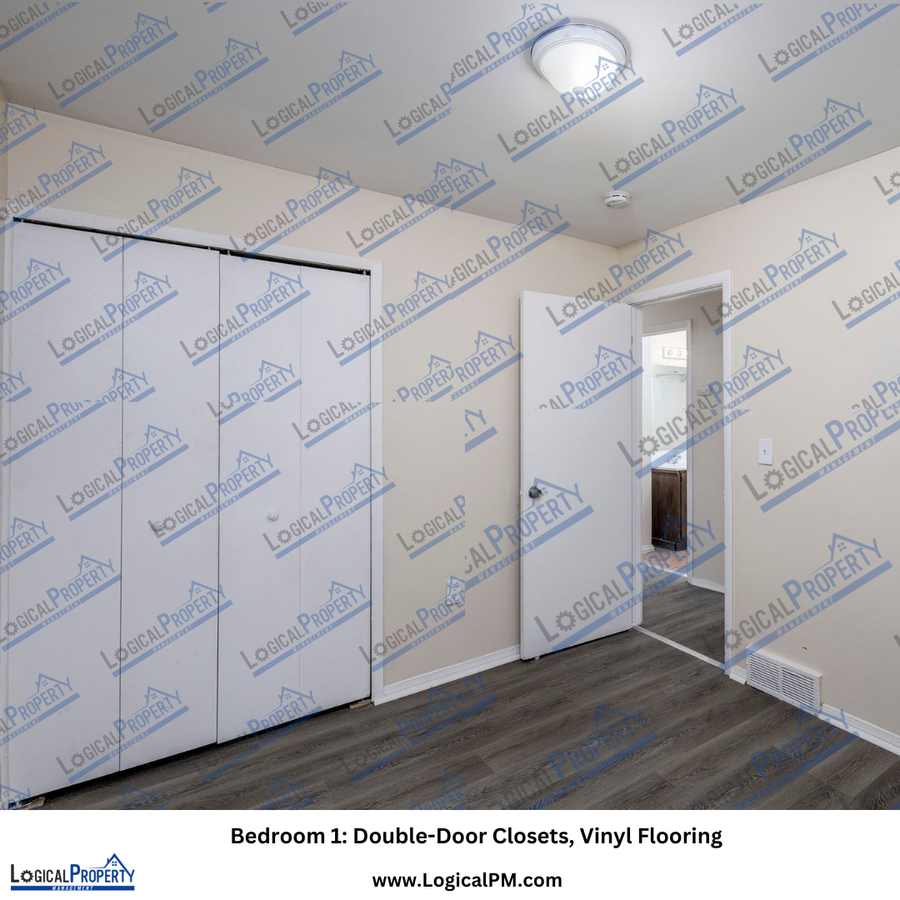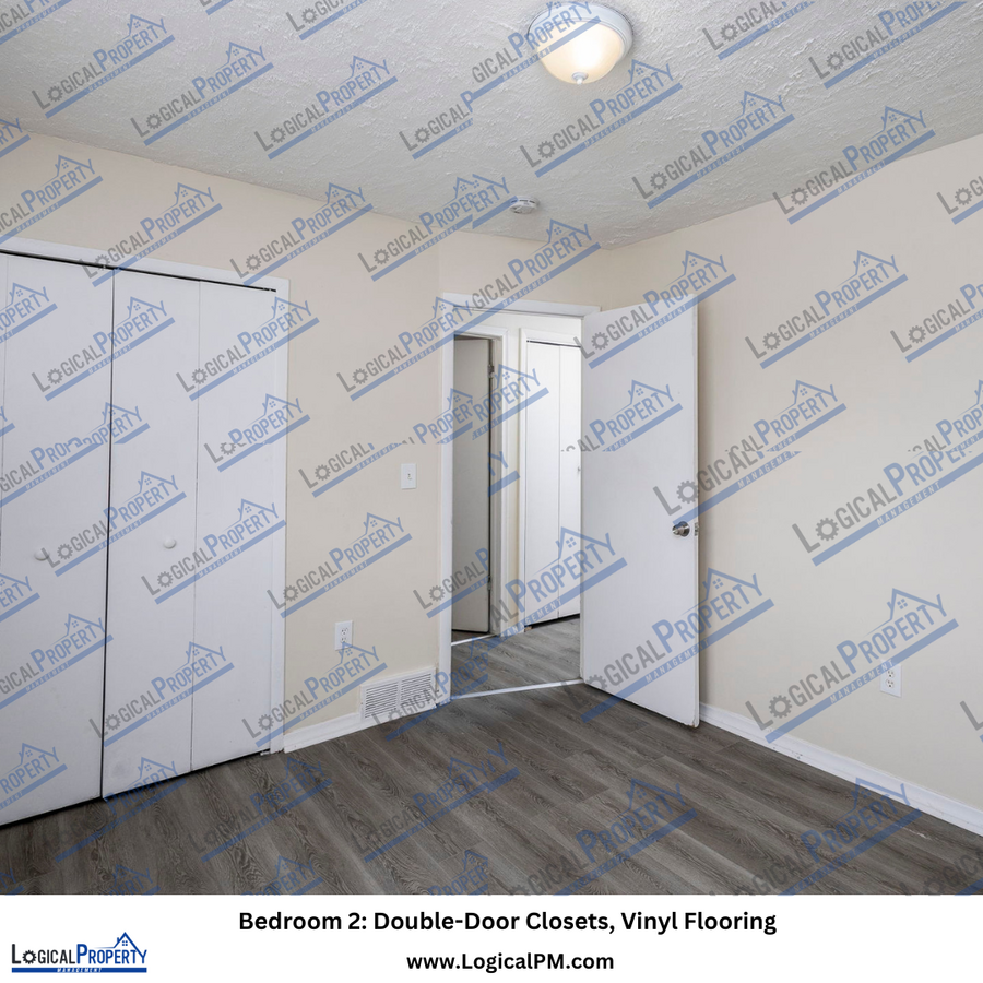 Each of the three bedrooms features matching vinyl flooring, ample closet space, and double windows that fill the rooms with natural light.