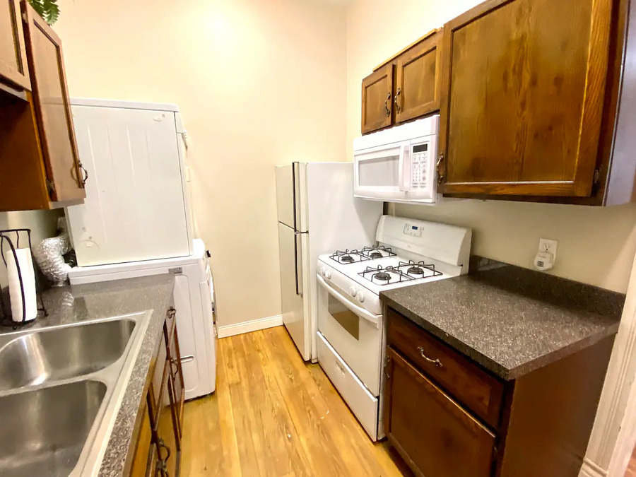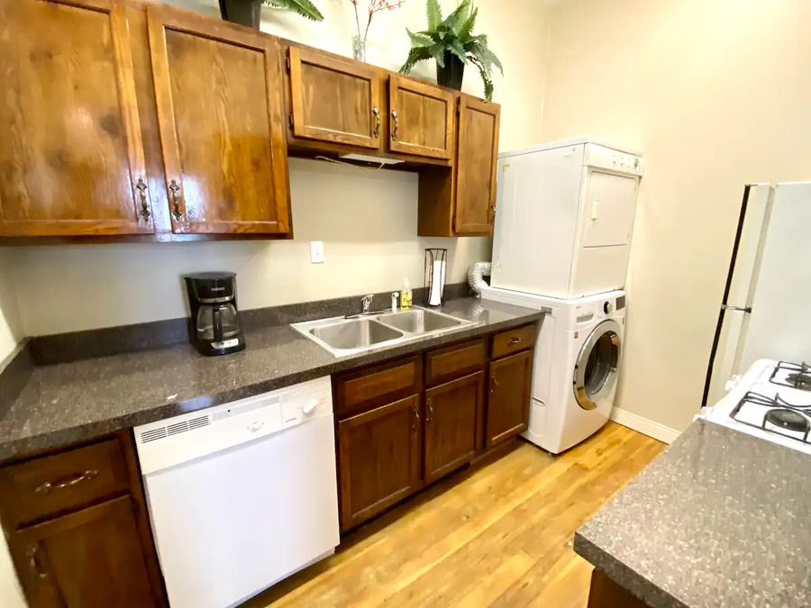 Appliances: Range, Fridge, Dishwasher, Stackable washer/dryer.