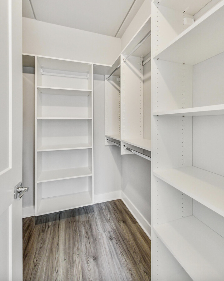The apartments here are stunning, spacious layouts adorned with oak-toned plank flooring. The exposed concrete ceilings add character and an urban edge. In the kitchen, European-style cabinetry complements the sleek quartz countertops, while the bathrooms feature porcelain tile walls and floors, complete with luxurious glass-enclosed showers. Convenience is paramount, thanks to in-unit laundry and custom-built shelving in the closets.