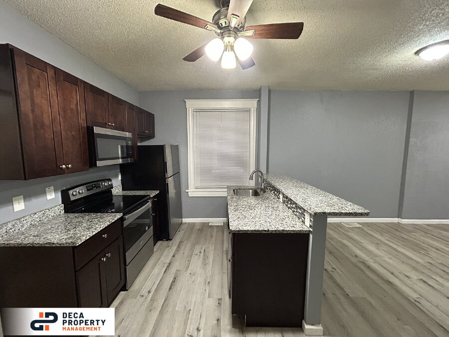 Step inside to a spacious living room filled with bright lighting, durable LVP flooring, and a ceiling fan for added comfort. The layout flows seamlessly into the kitchen and dining area, where you'll find granite countertops, ample cabinet storage, and sleek stainless-steel appliances including a dishwasher, electric oven, refrigerator, and microwave.
