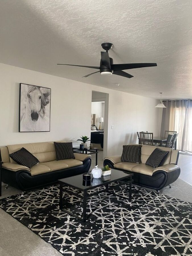 The backyard is a generous size, providing plenty of room for relaxation or play. Inside, the living room features comfortable carpeting, creating a warm and inviting space to unwind.