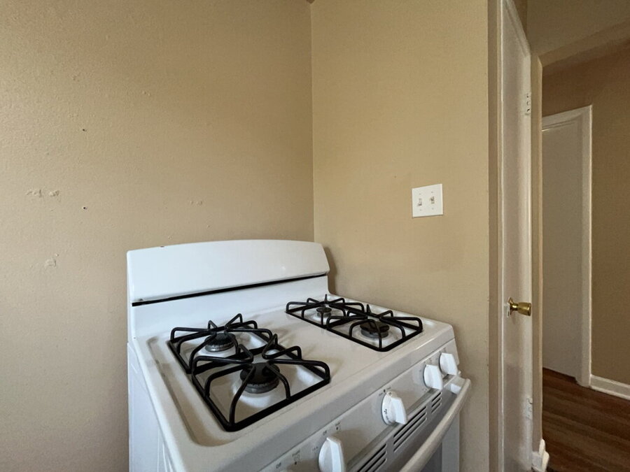 Step inside to find a well-equipped kitchen with a gas stove/range, refrigerator, and sleek solid countertops, offering a practical and stylish space for culinary endeavors.