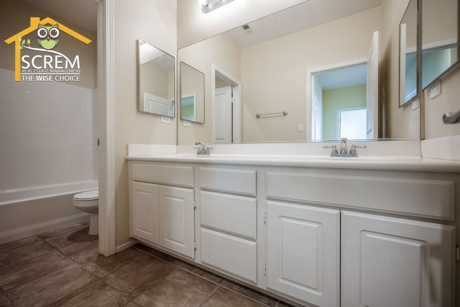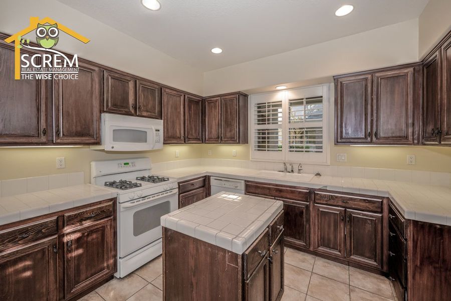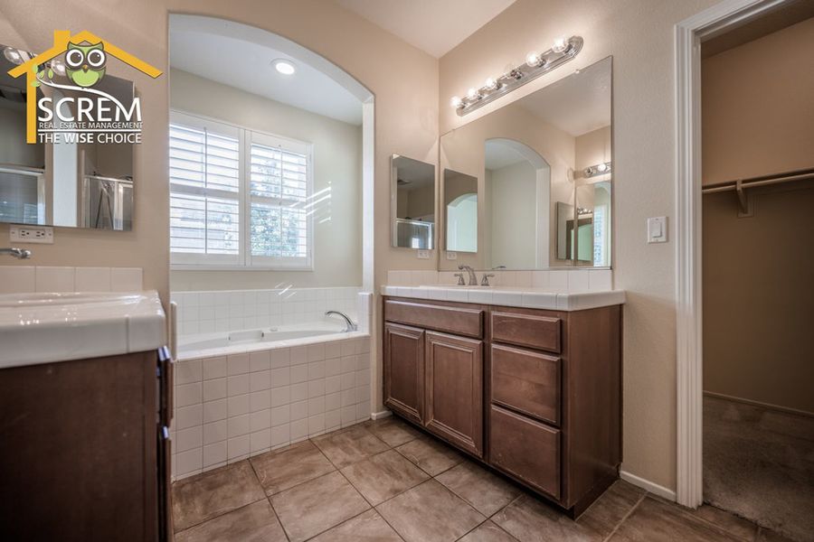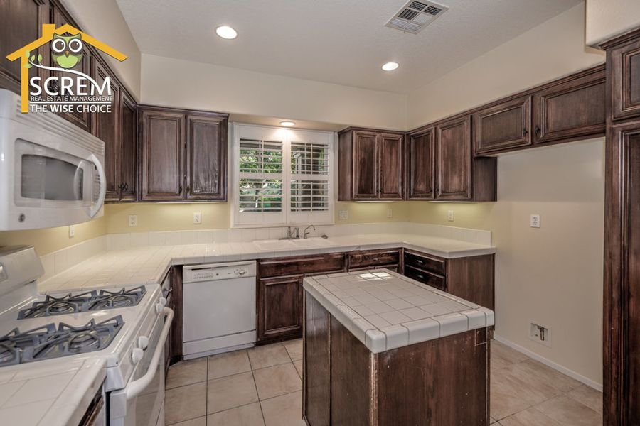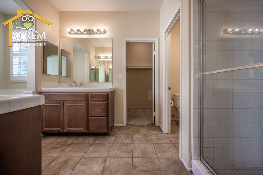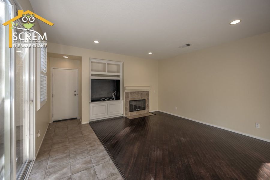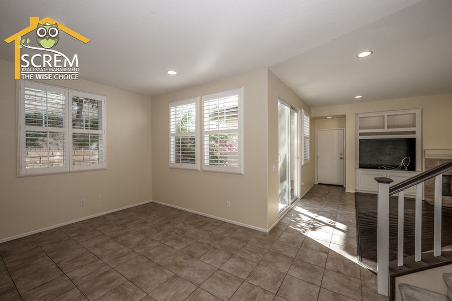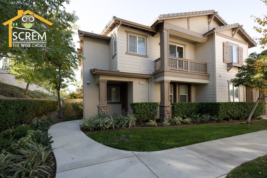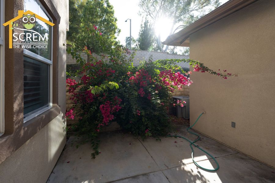 Charming three-bedroom Creekside townhome in Valencia. A beautifully landscaped walkway leads to the private entrance. Step into the formal living room featuring ceramic tile flooring and shutters. The kitchen offers tile countertops, recessed lighting, additional shutters, and ceramic tile flooring. It comes equipped with a gas stove, dishwasher, single oven, and microwave, and it opens to a spacious dining area. The family room features laminate flooring, a gas fireplace with a tiled border, a built-in entertainment center with shelves and cabinets, and a sliding glass door that leads to a large patio. There are two guest bedrooms, both with laminate flooring, one of which includes a walk-in closet. The full guest bathroom with double sinks. The primary bedroom features a ceiling fan, carpeting, a sliding glass door opening to a small balcony, and a walk-in closet. The attached bathroom features dual vanities, a spa bathtub, and a separate walk-in shower. Residents can enjoy the HOA pool and spa area. This community is conveniently located near Paseo walking and biking trails, parks, schools, and shopping. *The owner may consider a small pet.