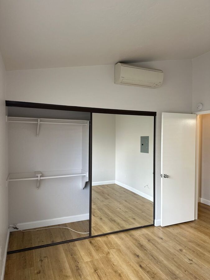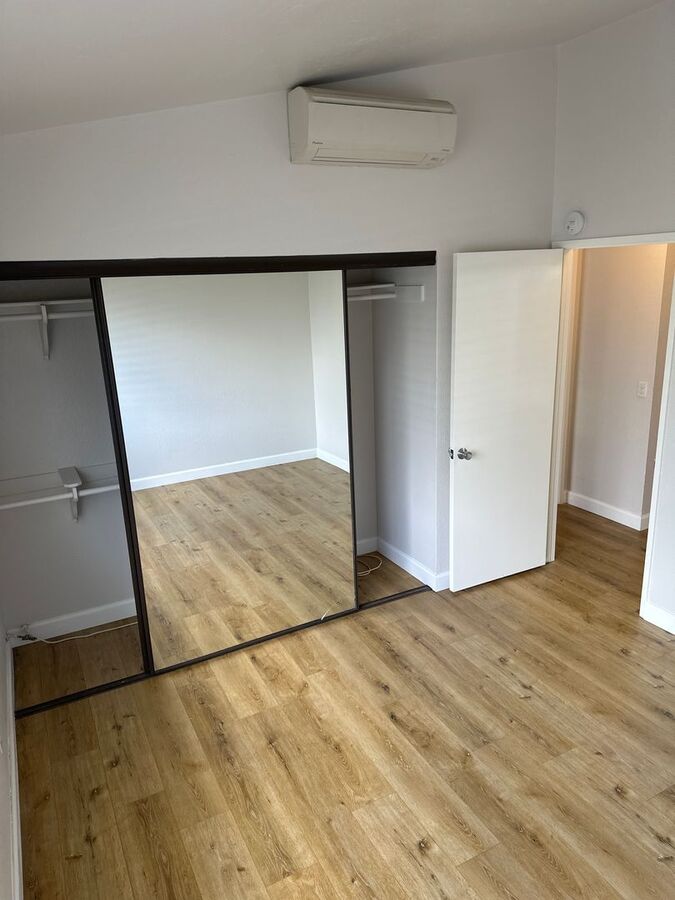 Inside, the home features fresh paint, laminate flooring throughout, and multiple cooling options including A/C units in both bedrooms, a wall A/C in the living room, and a whole-house fan for added comfort year-round.