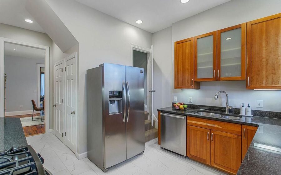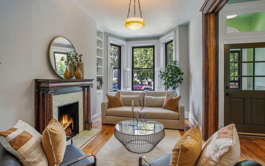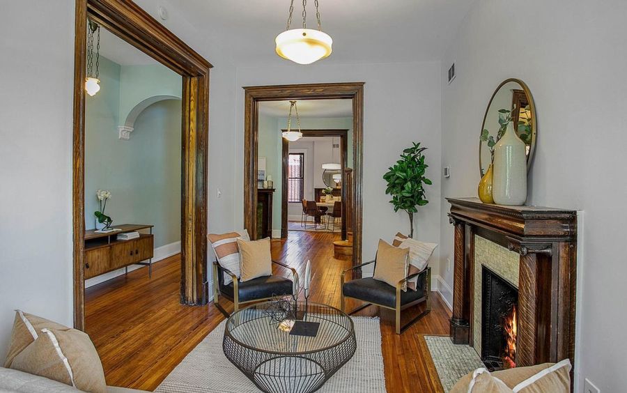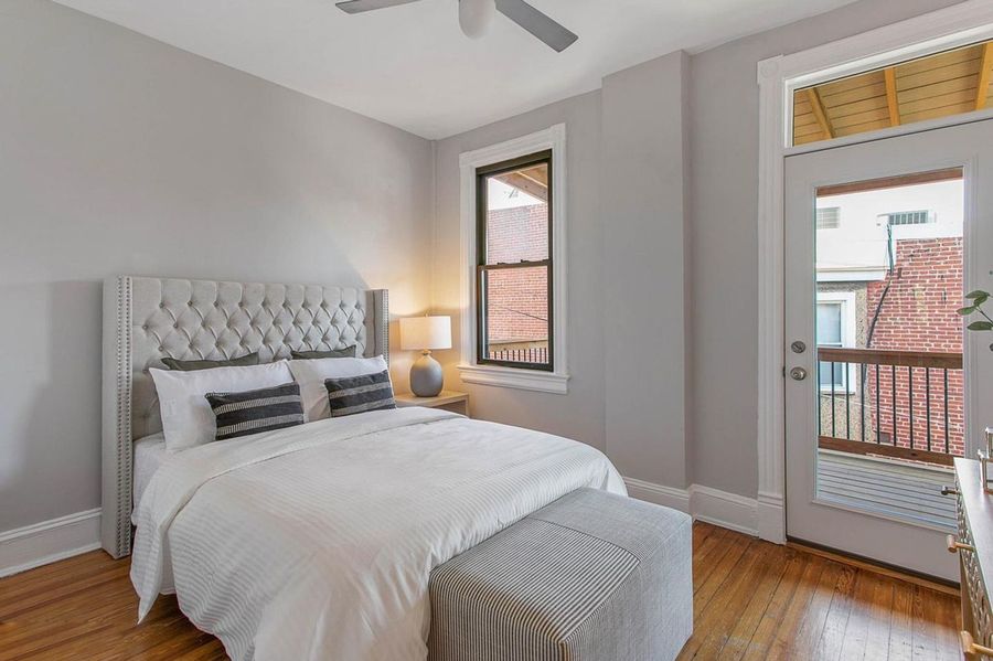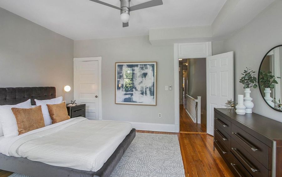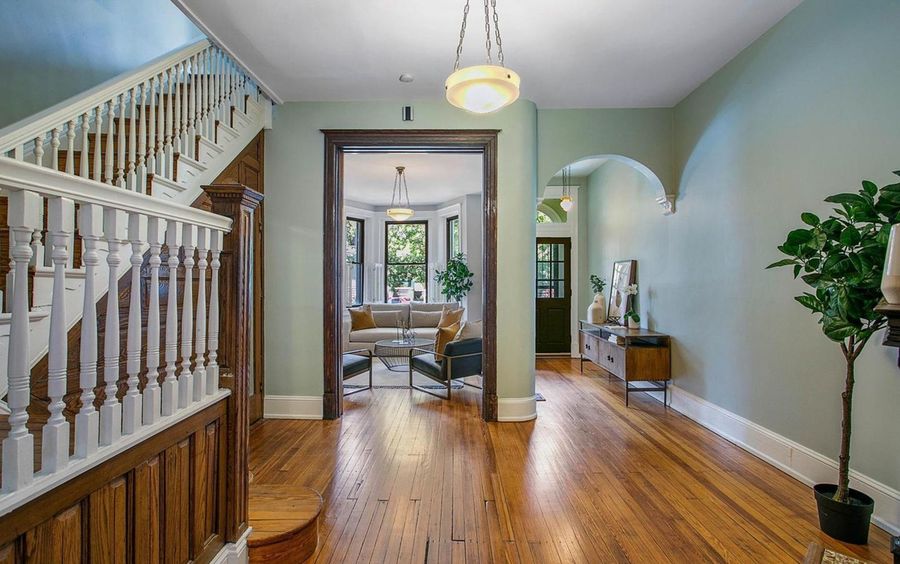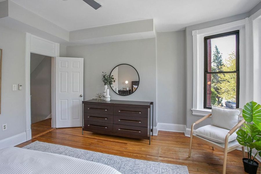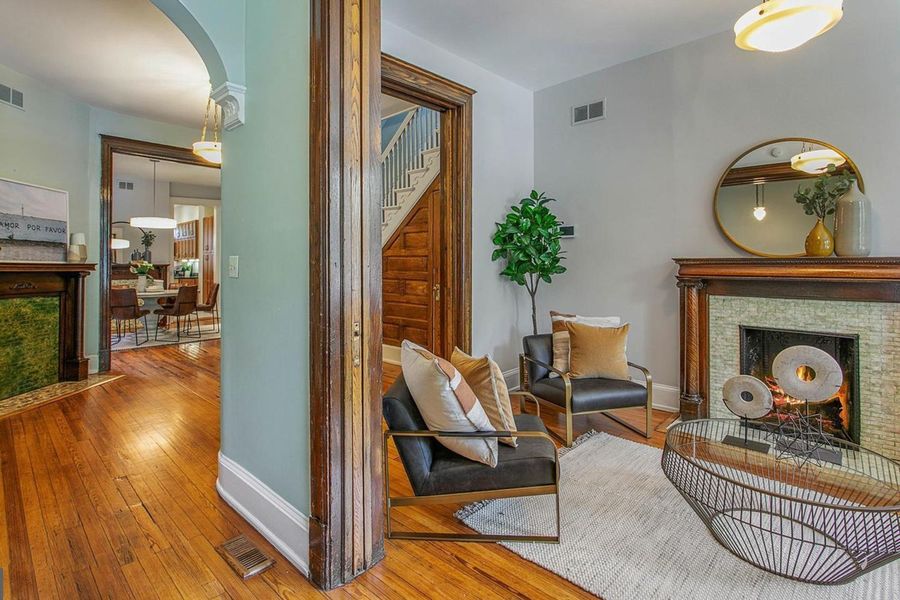This beautiful 4bd/2.5bath home has everything you need for city living! Spanning 3 levels and over 2500 sq/ft, and charming features like original hardwood flooring, gorgeous pocket doors, high ceilings, and wood trim/molding throughout the space doesn't disappoint. After entering into the unit's classic foyer, to the left, you will find the living and dining areas with plenty of windows, built-in bookcases, and two decorative fireplaces. Pass the convenient half bath and into the kitchen complete with stone countertops, stainless steel appliances including a gas range, and plenty of hardwood cabinets. A spacious deck is located out the back door. As you head up to the second floor, you'll find three spacious bedrooms, two full bathrooms, and laundry space. Don't miss the back bedroom that also has a private balcony. Finally, to the unit's top-level which houses a lovely front-facing bedroom and a flexible space that could serve as a lounge or home office.