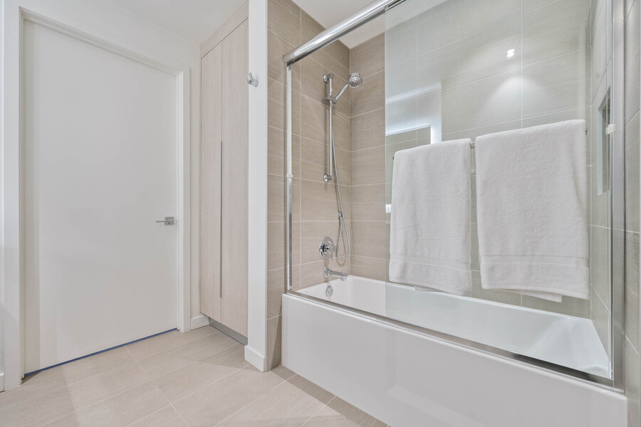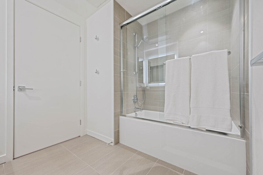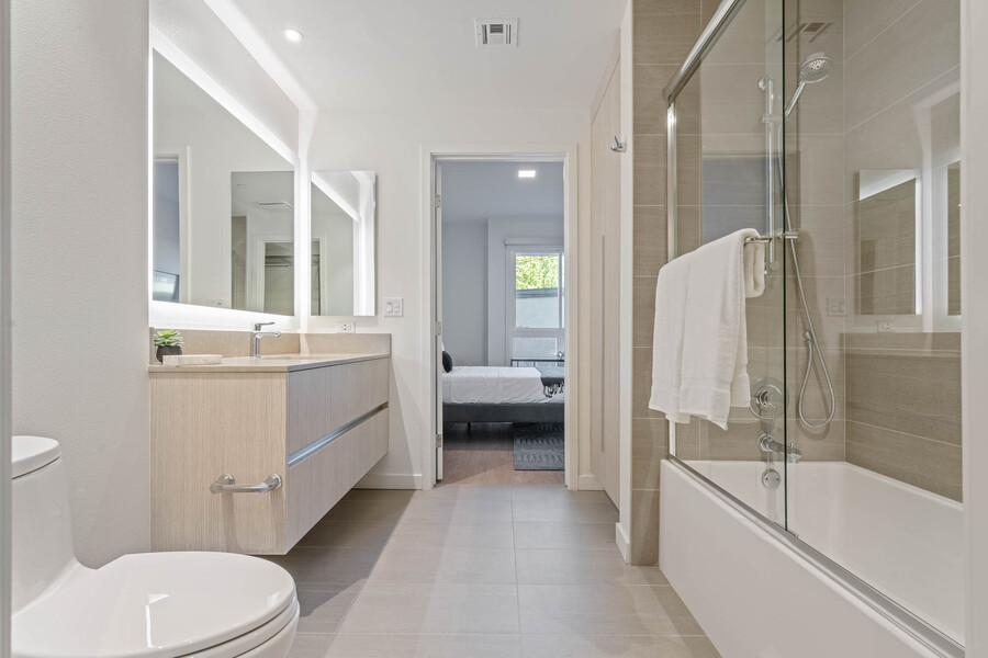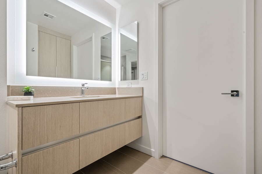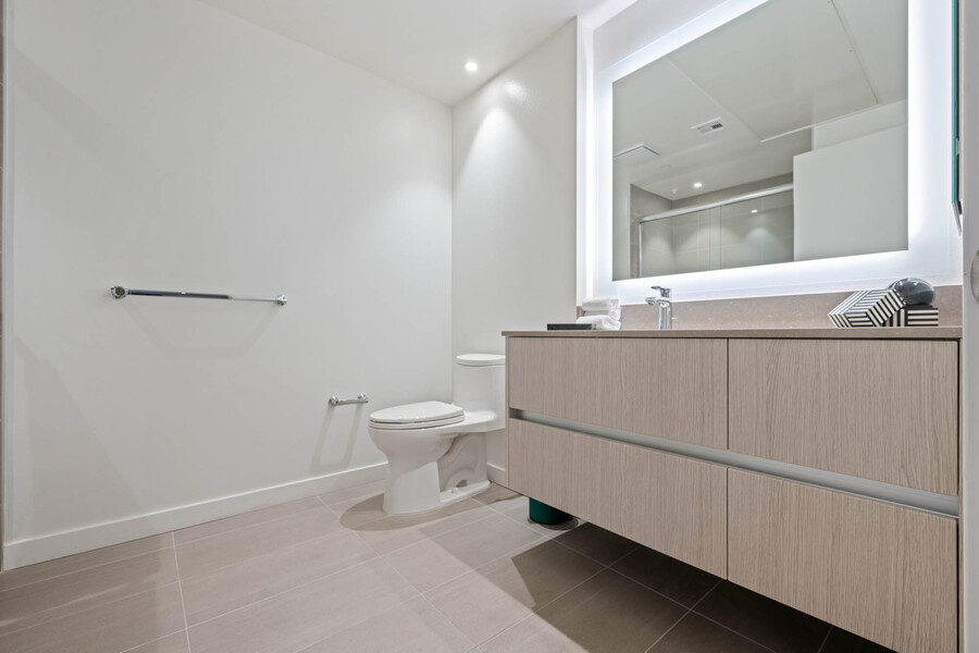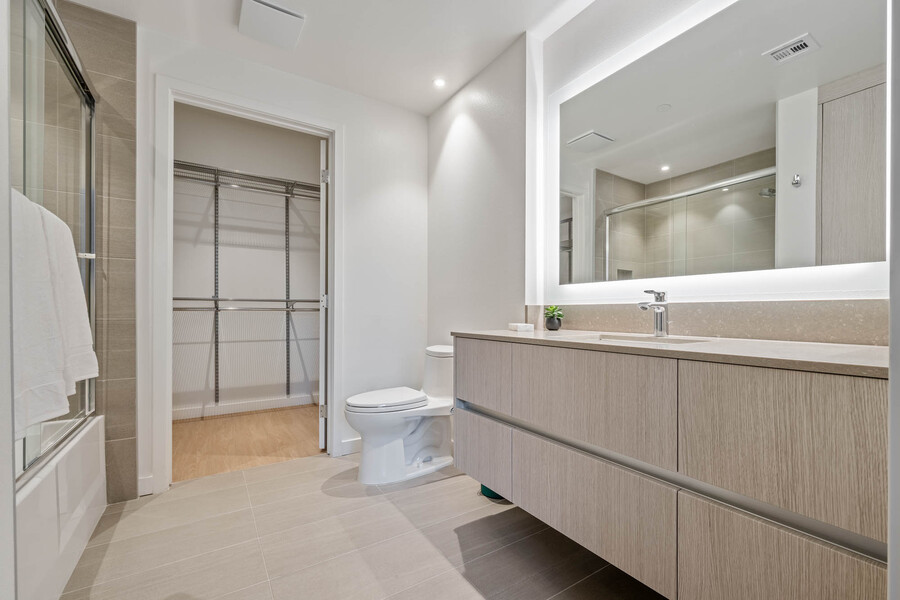 ~ Luxurious Bathrooms: Glass-enclosed soaking tub/shower, vanity with extra storage space, and back-lit mirror.
