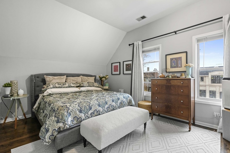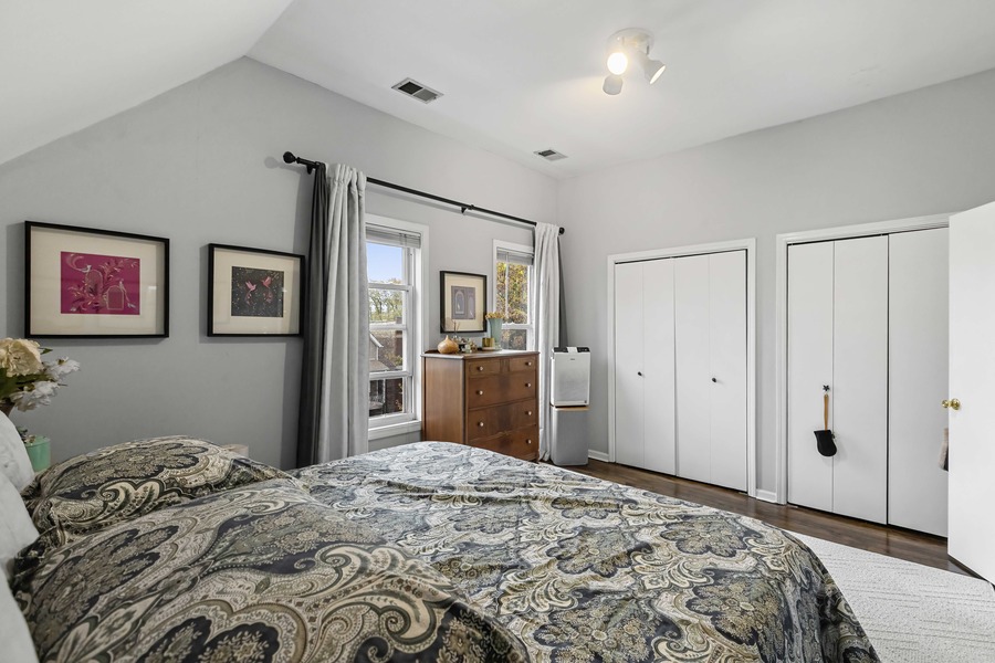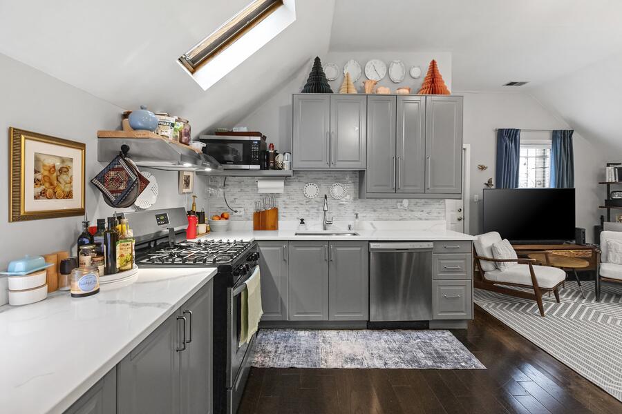 Step into this gorgeously renovated top-floor 2-bed, 1-bath apartment in the heart of highly sought-after Logan Square. The home features hardwood floors throughout, vaulted ceilings, central heat and air, and an in-unit washer/dryer. The beautifully updated kitchen offers gray shaker cabinets, white quartz countertops, a tile backsplash, and stainless steel appliances, opening seamlessly to a spacious open-concept living area with access to a private deck-perfect for relaxing or entertaining. Both bedrooms are generously sized, with the primary bedroom featuring a walk-in closet. Ideally located just steps from Logan Boulevard and the popular Logan Square Farmers Market, with easy access to I-90/94 and the Blue Line for a smooth commute. Enjoy nearby green spaces including Logan Square Park, Haas Park, Dog Park, and Skate Park. Conveniently close to Target, Costco, Jewel-Osco, Mariano's, Aldi, local gyms like LA Fitness and Planet Fitness, and all the restaurants, bars, and shopping Logan Square is known for.