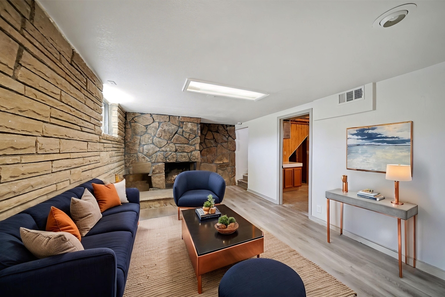 Downstairs, you'll find a cozy second living area with a stone fireplace, a private third bedroom, and a second full bathroom featuring a walk-in shower.