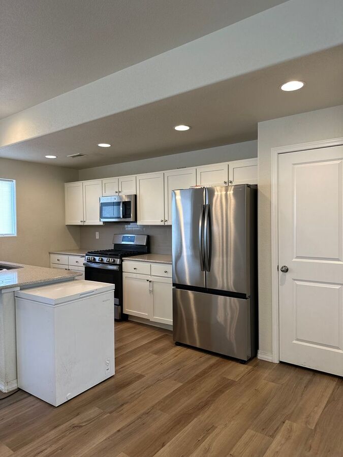 Beautiful 2024-built 3-story single-family home featuring the Crestone floor plan with 1,739 sq ft, 3 beds / 2.5 baths, and a 2-car garage. Open-concept main level with spacious living/dining/kitchen, plus full-size washer & dryer included. All bedrooms upstairs including primary suite w/ walk-in closet. Fenced yard, covered patio, alarm system, and HOA maintains yards.