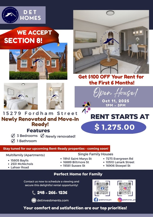 Newly Renovated 3-Bedroom Home at 15279 Fordham Street – $1,275/Month