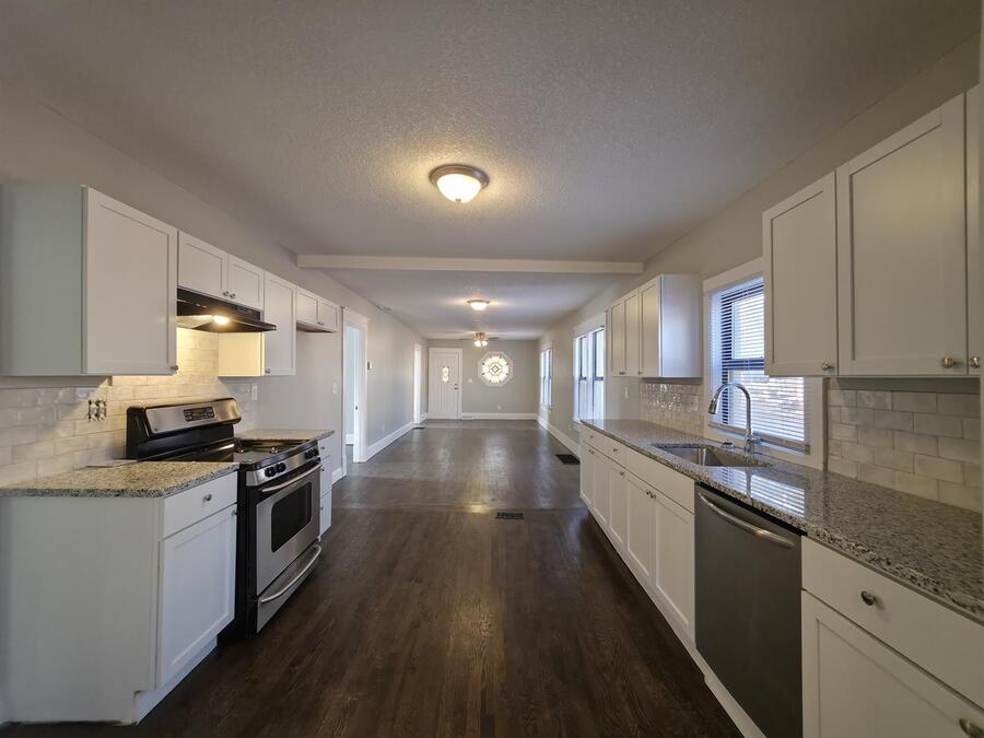 Inside, the home features a large open-concept living, kitchen, and dining area highlighted by attractive hardwood floors, abundant natural light, and a ceiling fan that enhances comfort and flow. The kitchen is well-appointed with ample cabinetry, granite countertops, a tile backsplash, and stainless steel stove and dishwasher, creating a polished yet practical space for daily living and entertaining.